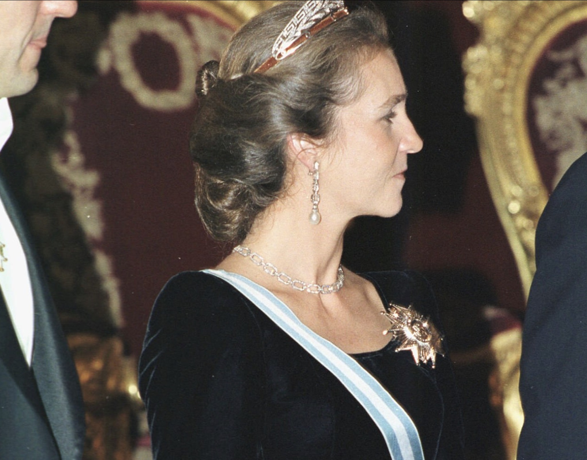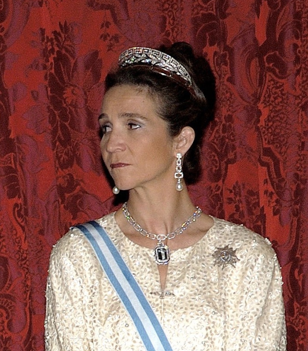 The diamond chain necklace became something of a signature jewel for the Infanta during the late 1990s and early 2000s. It was notably paired with the Marichalar Tiara for several state banquets at the Royal Palace of Madrid.