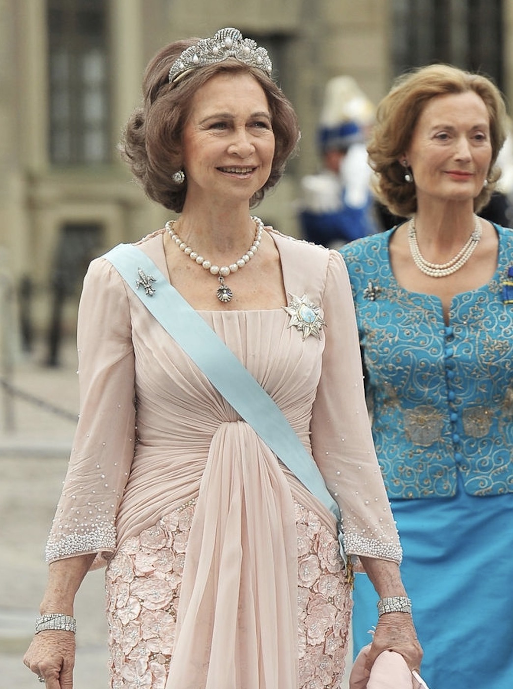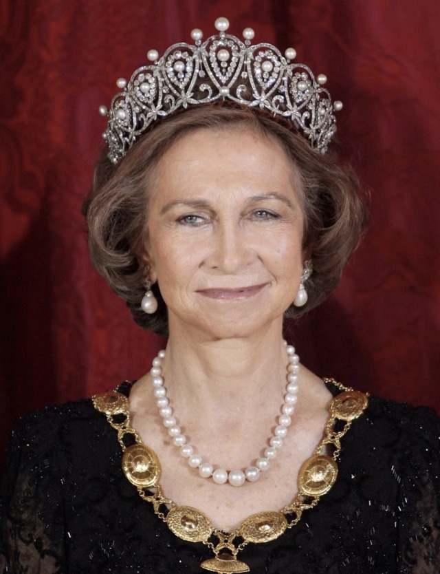 Queen Sofía wore the necklace for the wedding of her eldest daughter, Infanta Elena, in 1995. The Queen also wore the pearls for important dynastic weddings across Europe: the wedding of the Duke of Brabant in 1999, the wedding of the Prince of Orange in 2002, and the wedding of the Crown Princess of Sweden in 2010, paired with the Mellerio Shell Tiara.