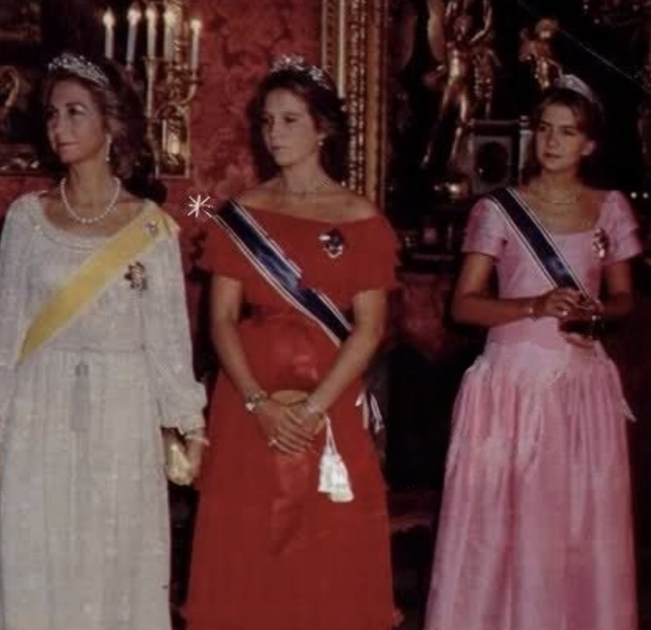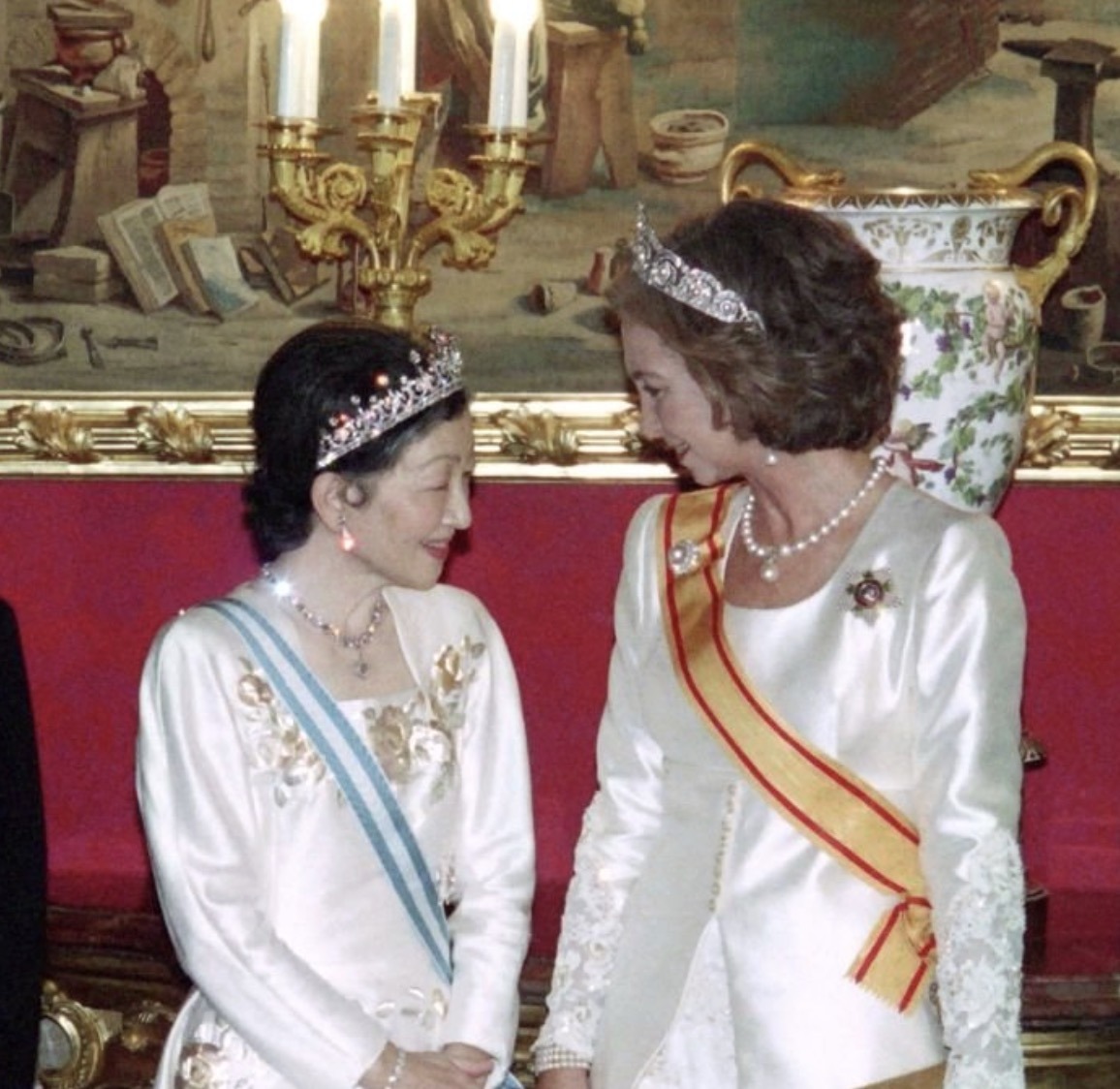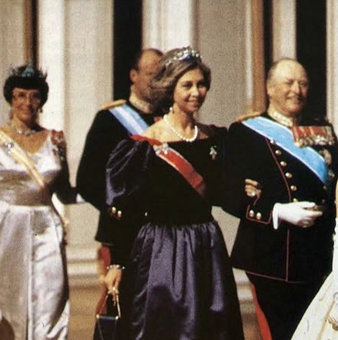 Queen Sofía wore the necklace extensively throughout the 1980s and 1990s. It was probably her most worn heirloom among the historic Spanish jewel collection. Her Majesty often paired it with the family’s tiaras for state banquets at the Royal Palace of Madrid, notably for the Nepalese State Visit in 1983, the Belgian State Visit in 1994, the Japanese State Visit in 1994. The Queen also wore it on visits abroad, such as a State Visit to Japan in 1980, a State Visit to Norway in 1982.