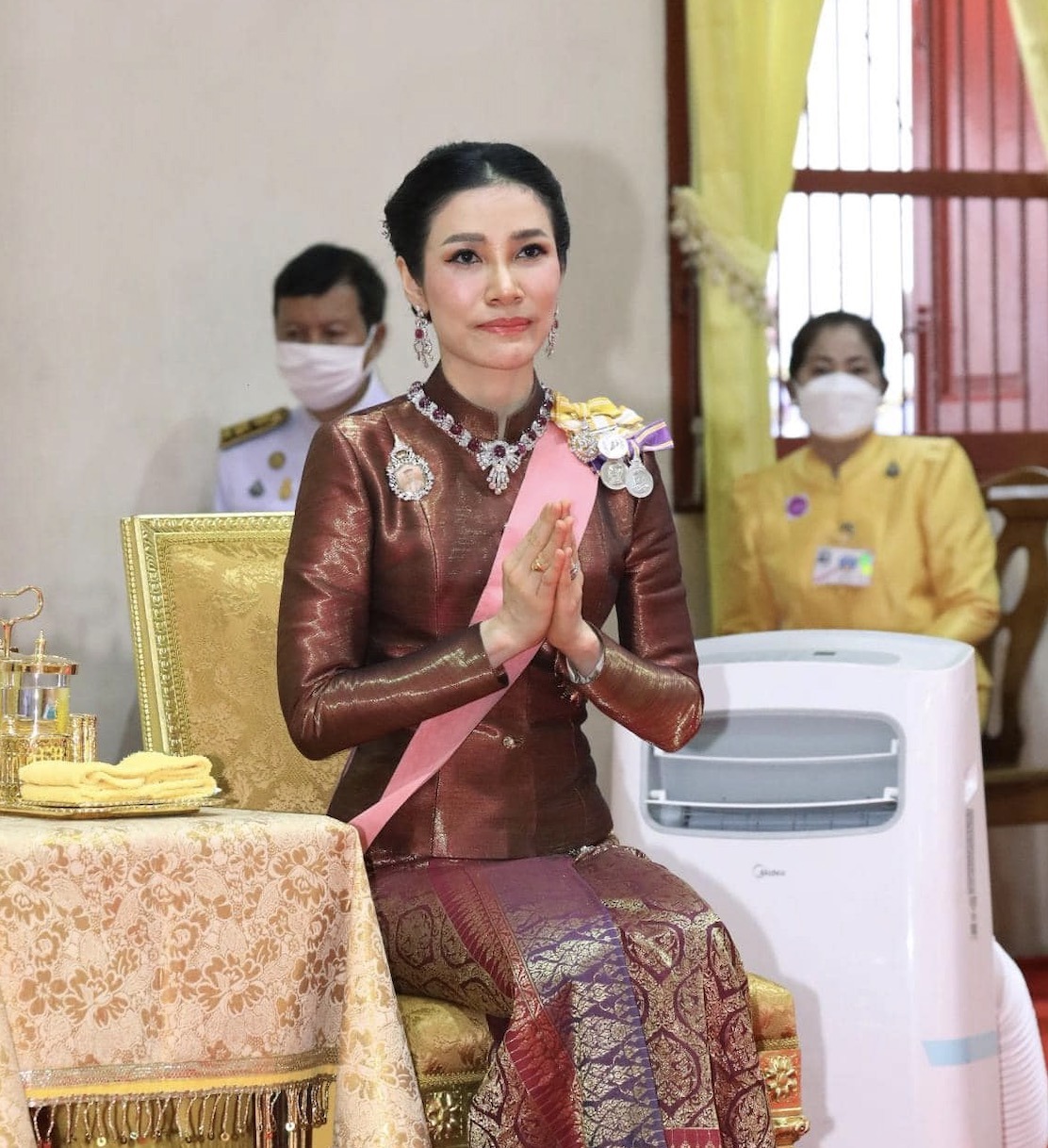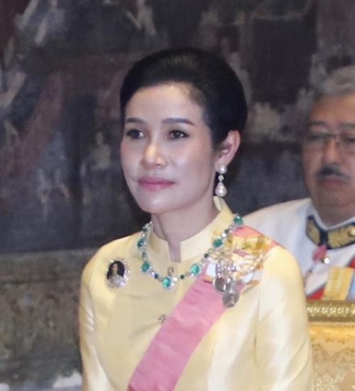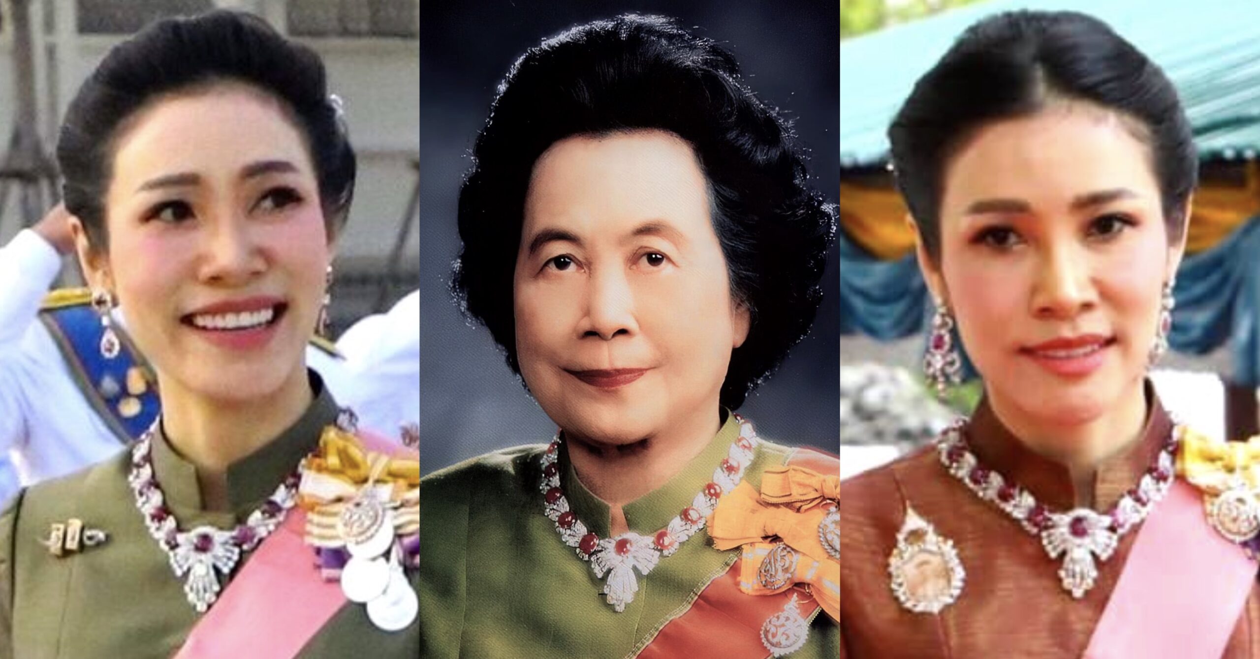 More recently,  King Maha Vajiralongkorn‘s Royal Noble Consort Sineenat Bilaskalayani wore Princess Bejaratana’s Ruby Necklace with Queen Sirikit’s Ruby Earrings when she represented the King to preside over the Royal Kathin Robes Offering Ceremony at Wat Phra Pathommachedi Temple.