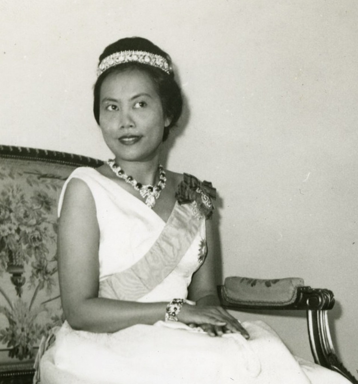 Princess Bejaratana notably wore her Ruby and Diamond Necklace for a striking official portrait with Queen Sirikit’s Thai Tiara for a portrait in the 1960s.