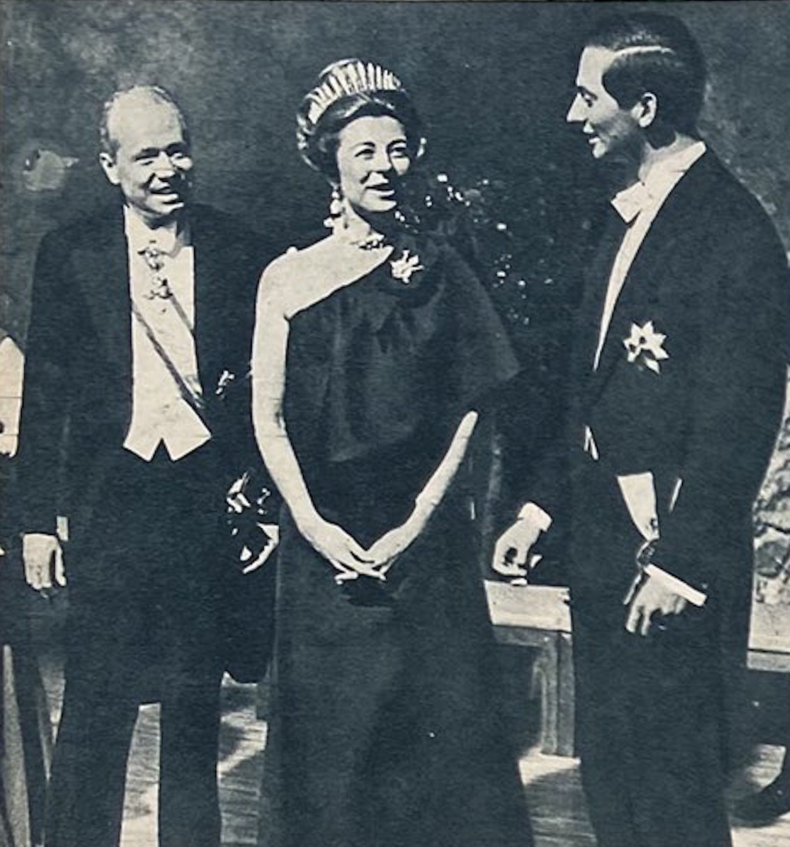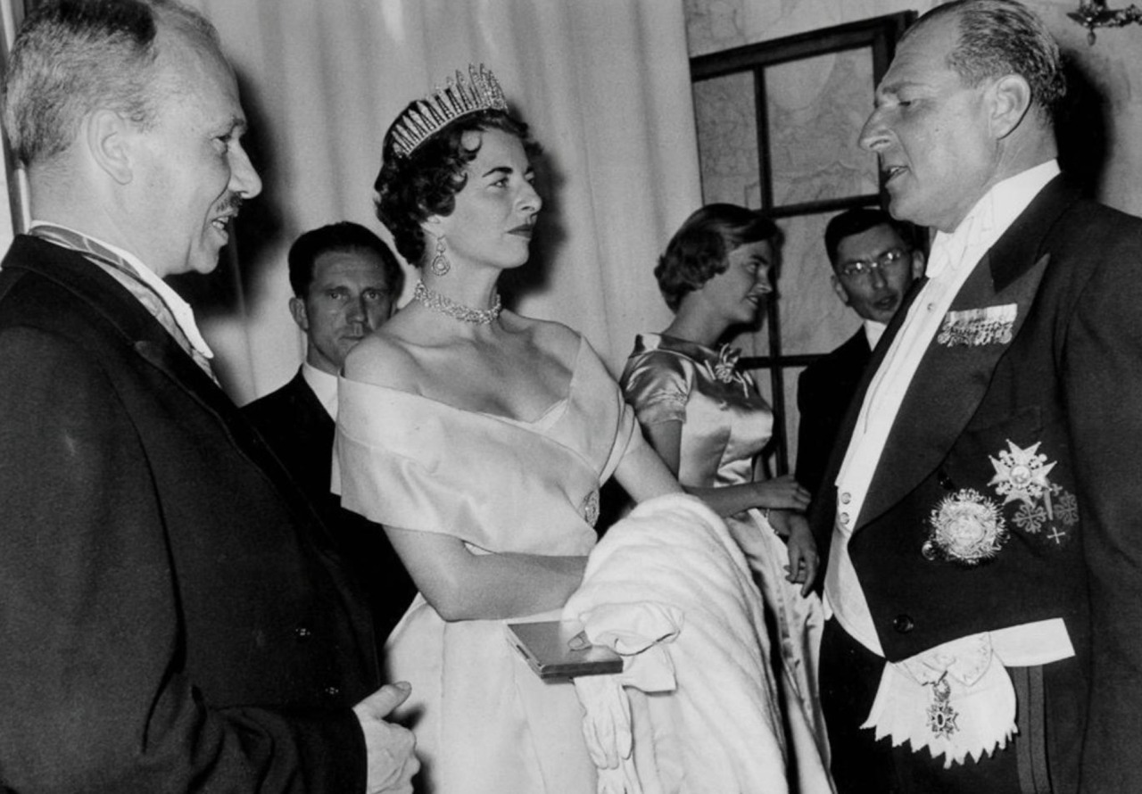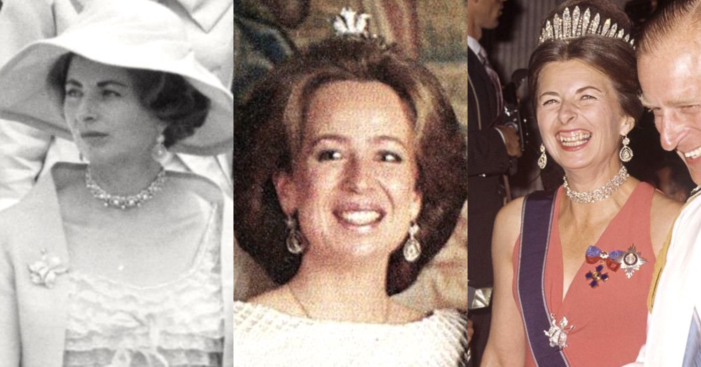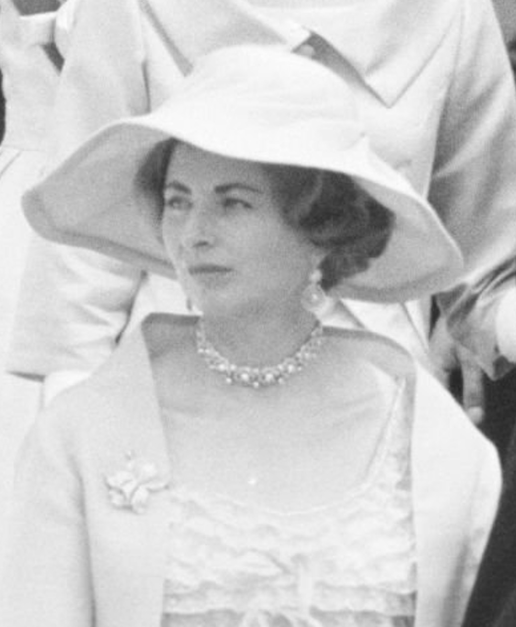 In the 1950s and 1970s, Princess Gina frequently paired the Diamond Brooch with her Diamond Earrings and Diamond Choker, like for the Wedding of Prince Juan Carlos of Spain and Princess Sofia of Greece in 1962.