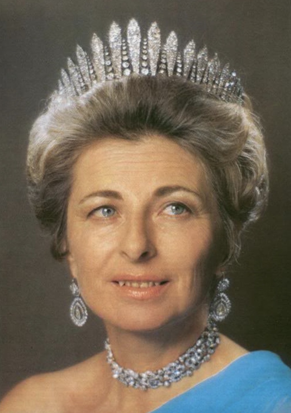 In 1988, Princess Gina’s only daughter, Princess Nora, wore the Diamond Brooch as a Tiara along with her mother’s Diamond Earrings when she married Don Vicente Sartorius y Cabeza de Vaca, Marqués de Mariño.