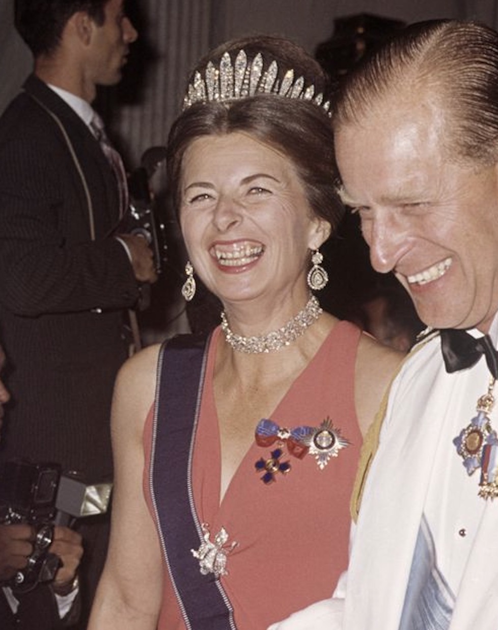 Princess Gina also paired the Brooch with the Habsburg Fringe Tiara for the Wedding Ball of King Constantine II of Greece and Princess Anne Marie of Denmark at the Royal Palace of Athens in 1964.