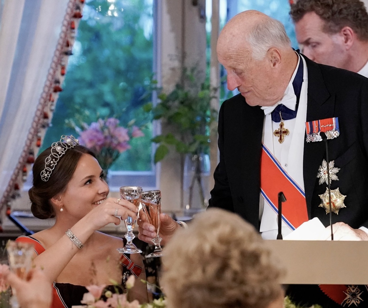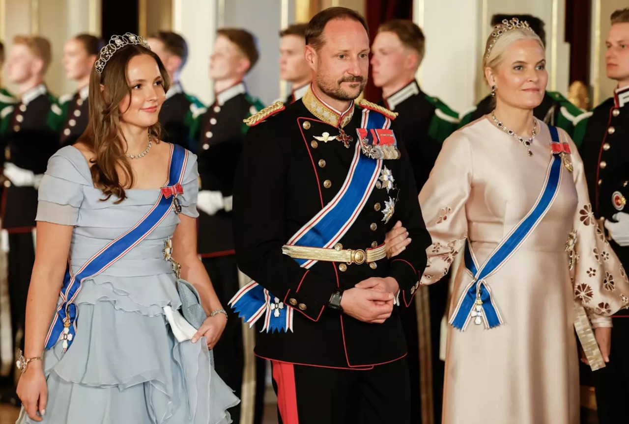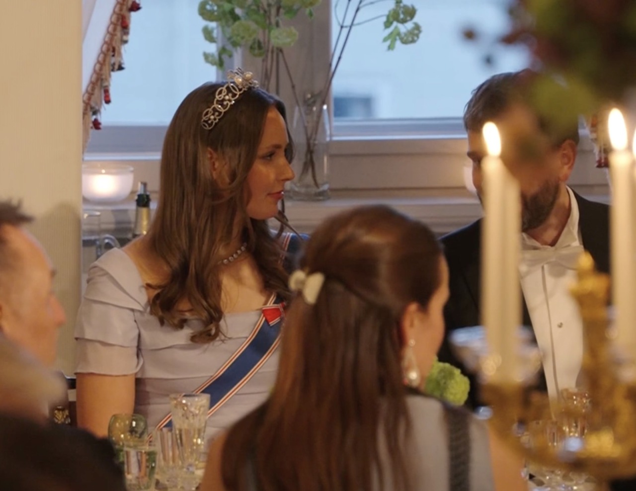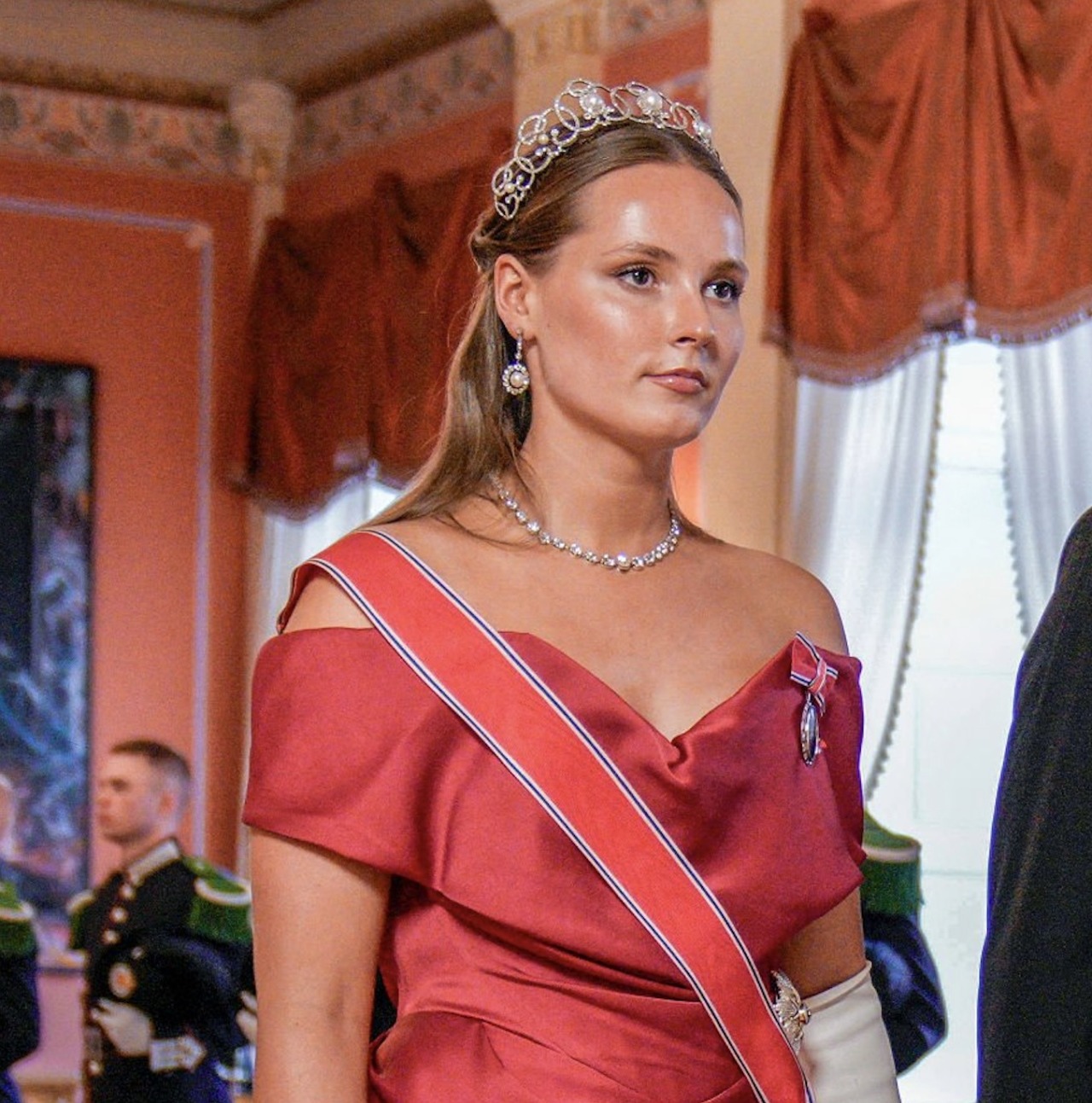 Princess Ingrid Alexandra debuted the Diamond Rivière, paired with Crown Princess Märtha’s Pearl Earrings, for King Harald’s 88th Birthday Dinner at the Royal Palace of Oslo last year.