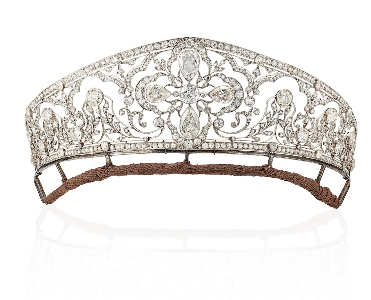 This tiara of diamonds set in platinum represents an exceptional specimen of the Belle Époque jewel design. With a half-moon shape, almost as a sort of kokoksnik tiara, very characteristic of this period, its’ openwork frame is filled with delicate diamond-set leaves, tendrils and arches. The central motif, a quatrefoil arrangement, presents four large pear-shaped diamonds and an important old European-cut diamond.