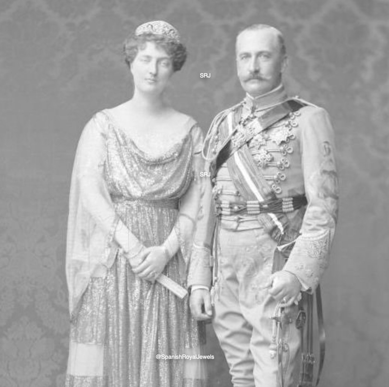 Don Carlos and Doña Luisa were hardworking and beloved members of the Spanish Royal Family, often accompanying King Alfonso XIII and Queen Victoria Eugenie, or doing solo engagements. The Infanta would wear her Diamond Kokoshnik Tiara for several gala occasions, as several photographs available attest. It was also worn for several studio photographs taken of the couple.