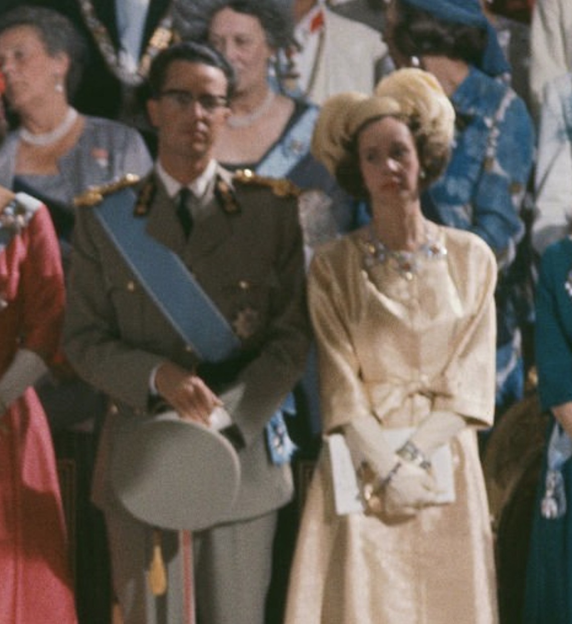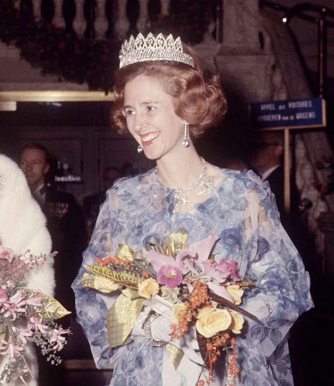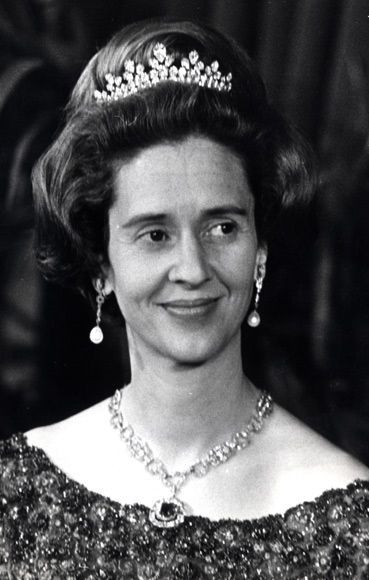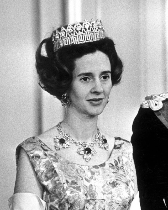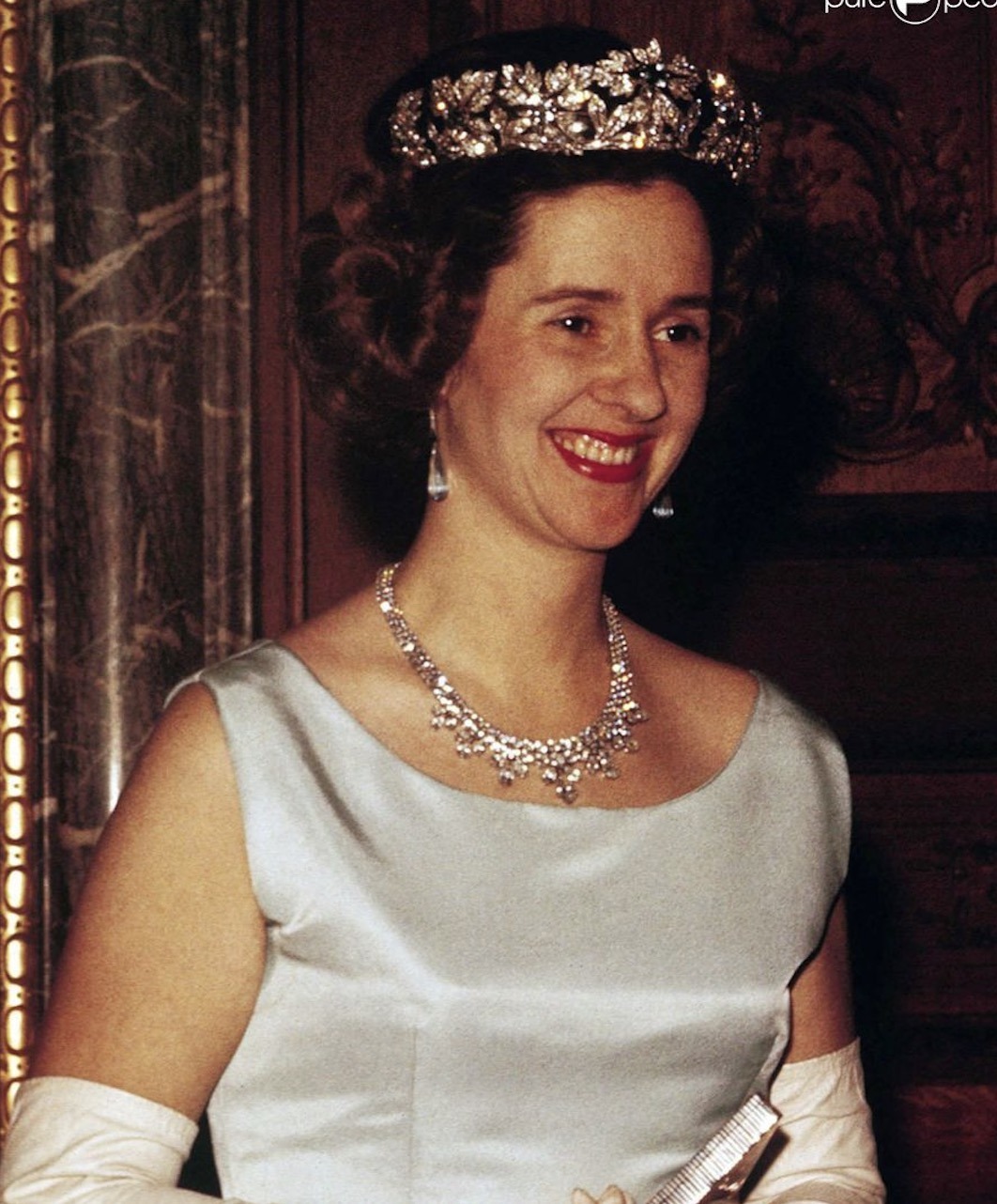 Queen Fabiola also used to wear the Diamond Necklace by itself or with several pendants including the Strawberry Leaves of her Tiara, including for the Wedding of King Constantine of Greece and Princess Anne Marie of Denmark in 1964, the Wedding of of Princess Beatrix of The Netherlands and Claus van Amsberg in 1966, the Wedding of Queen Margarethe of Denmark and Comte Henri de Montpezat in 1967, and the Belgian State Visit to Spain in 1977.