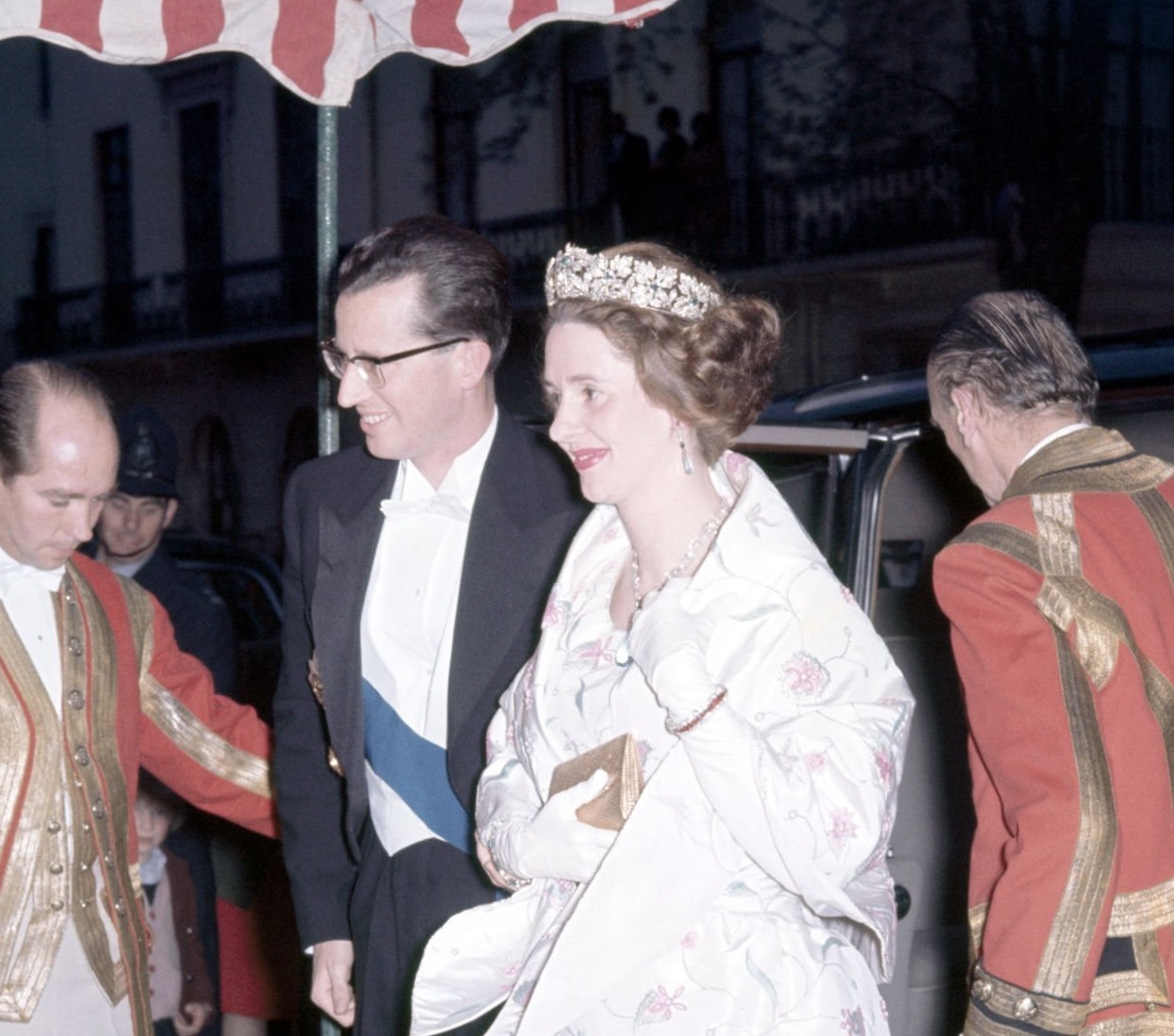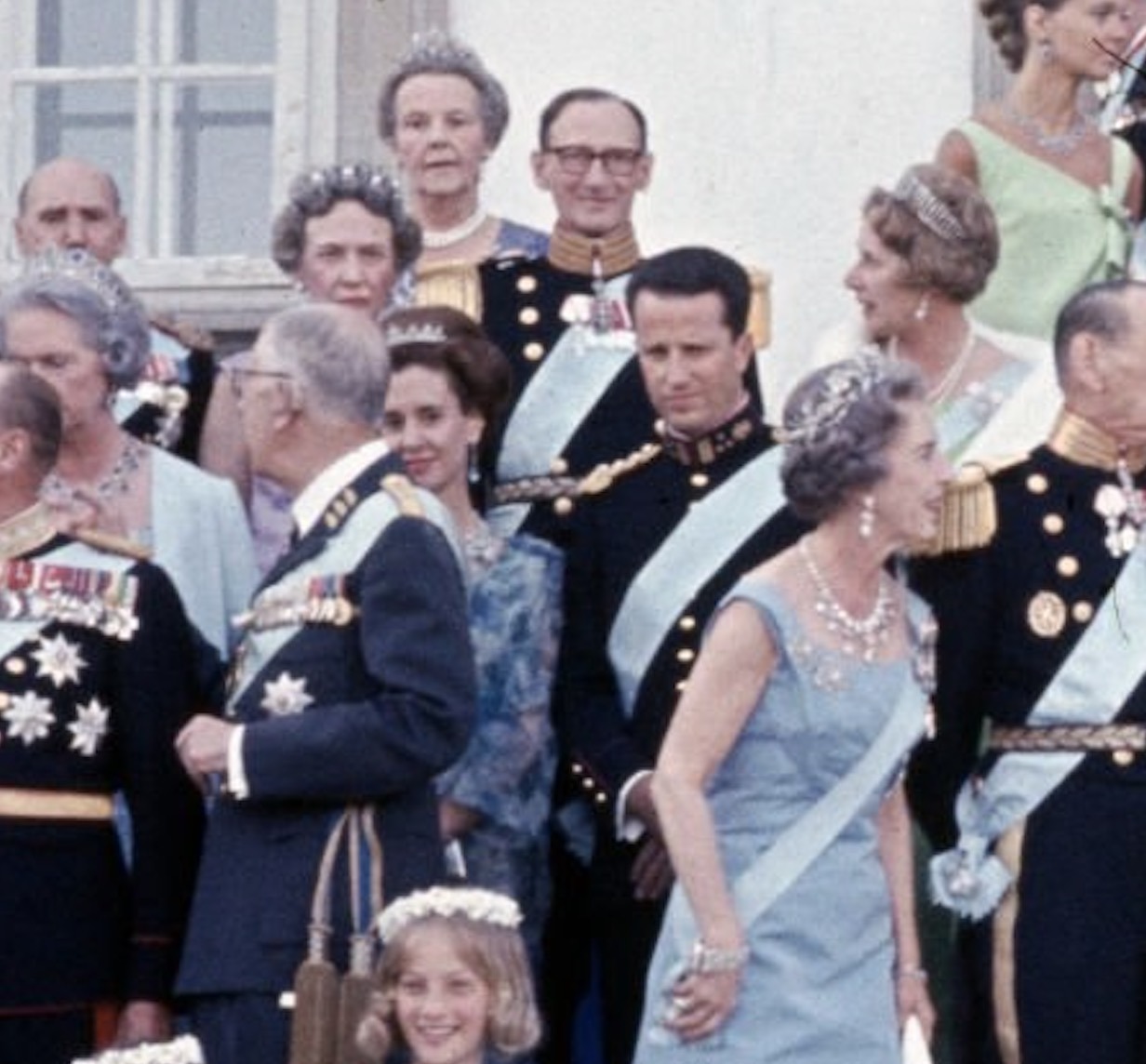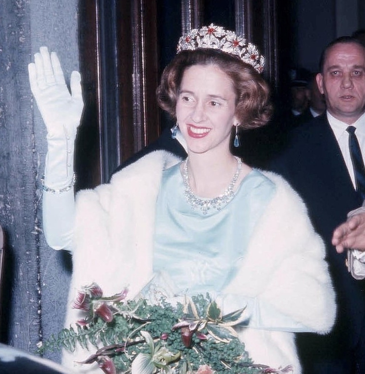 Queen Fabiola often wore the Diamond Sautoir with the Aquamarine Pendant and Earrings with the Aquamarine version of her Spanish Wedding Gift Tiara on several notable occasions, including the State Visit to Britain in 1963 and the Wedding Ball of King Constantine II of Greece and Princess Anne Marie of Denmark in 1964.