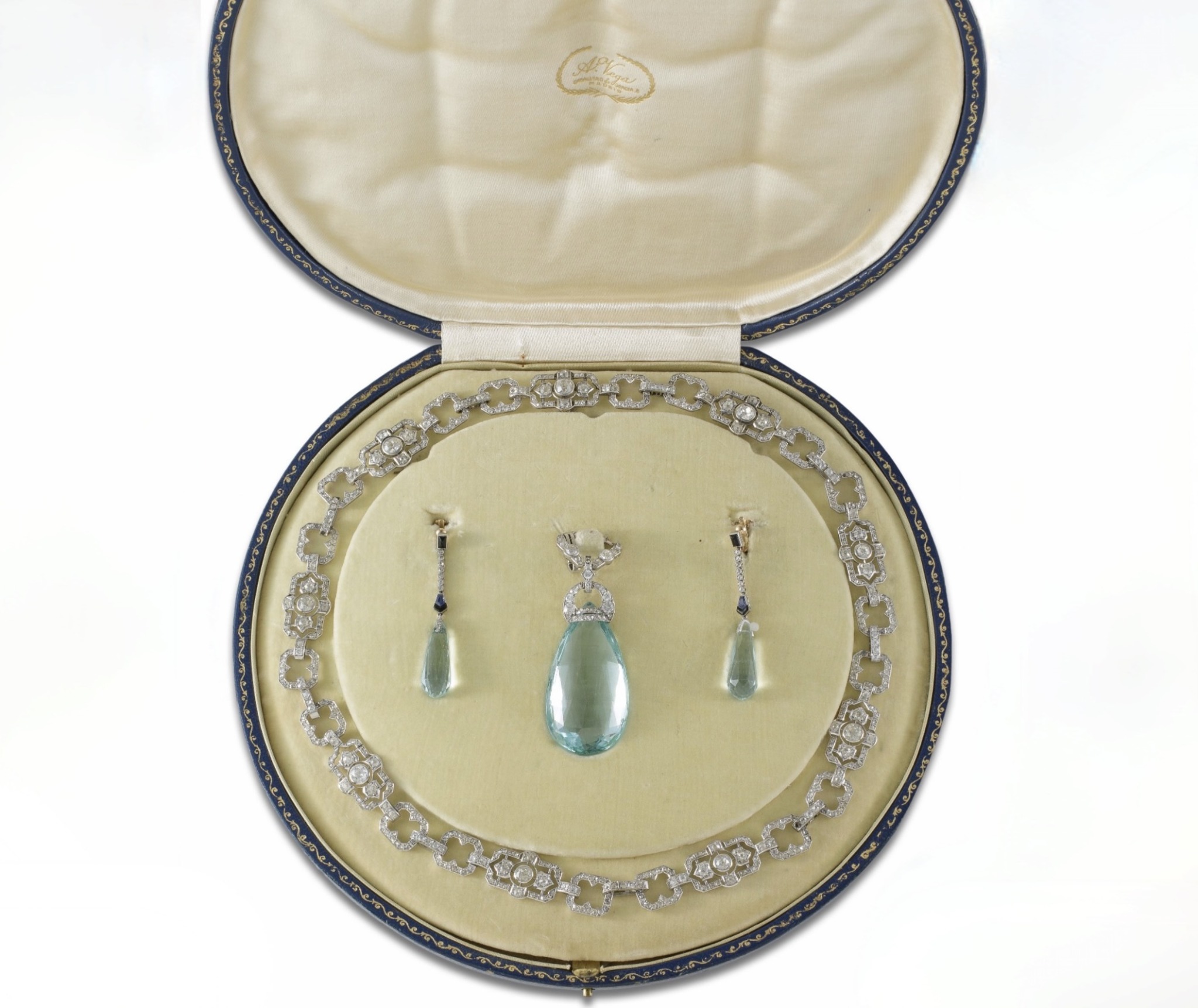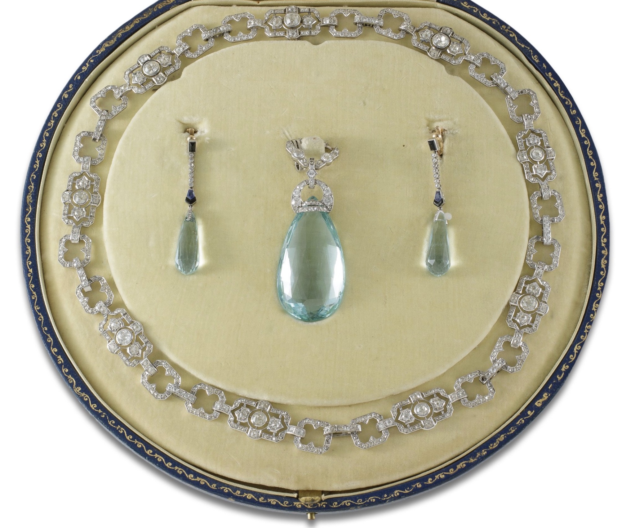 A 1920s demi-parure in platinum, comprising: a detachable necklace that can be transformed into three separate bracelets, featuring a geometric openwork link design adorned with old brilliant, Dutch cut, and 8/8 cut diamonds, with a total approximate weight of 38.62 carats; a pendant that can be attached to the necklace, featuring a large, natural, fancy briolette-cut aquamarine, with a total approximate weight of 120 carats; and a pair of long earrings in yellow gold and platinum, set with onyx cabochons, a row of diamonds, pentagonal-cut sapphires, and finished with briolette-cut aquamarines, with a total approximate weight of 24 carats. Screw-back closures. Comes with its original A. Vega jewelry box, lined with velvet and natural silk.