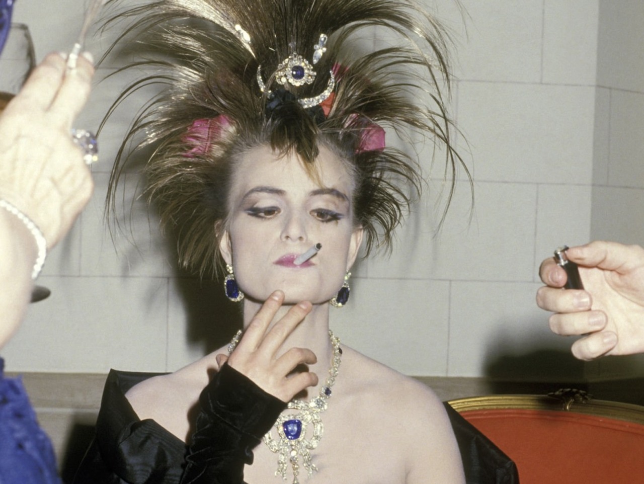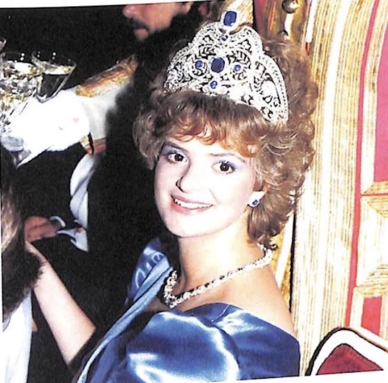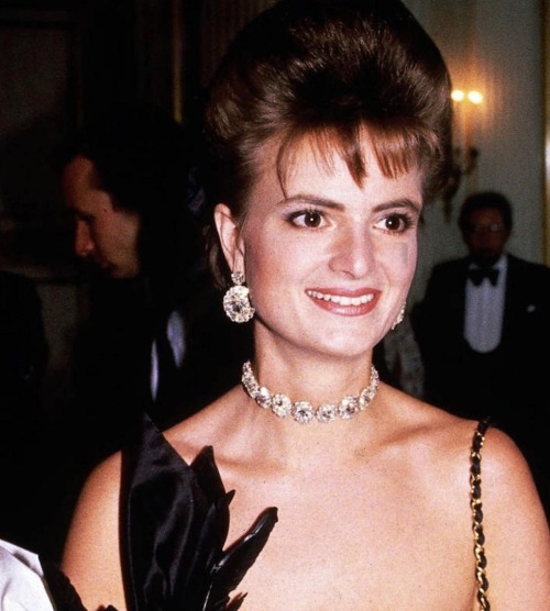 Princess Gloria also wore the sapphire and diamond necklace with the Sapphire Bow Brooch as a clasp for the 36th annual April in Paris Ball at the Waldorf Hotel in New York City, with a ridiculously outrageous hairstyle.