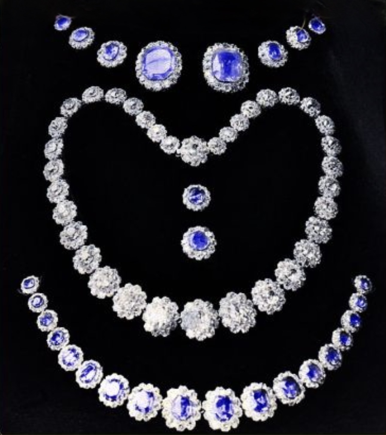 The magnificent Diamond Necklace was made using heirlooms diamonds by F.Kreuter at some point in the 19th century, along with the Sapphire Tiara and Parure. The central elements of the necklace can be replaced with sapphires.