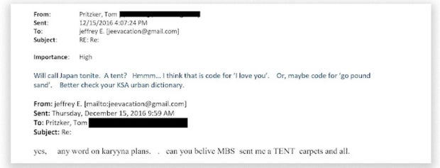 Crown Prince Mohamed bin Salman consolidated his control in Saudi Arabia in 2017 following a purge of high level government officials. A few days later, New York Times reporter Thomas Landon Jr. emailed Epstein, “Did your Saudi friends survive the purge?” Epstein responded, “All. With gods help ;).”