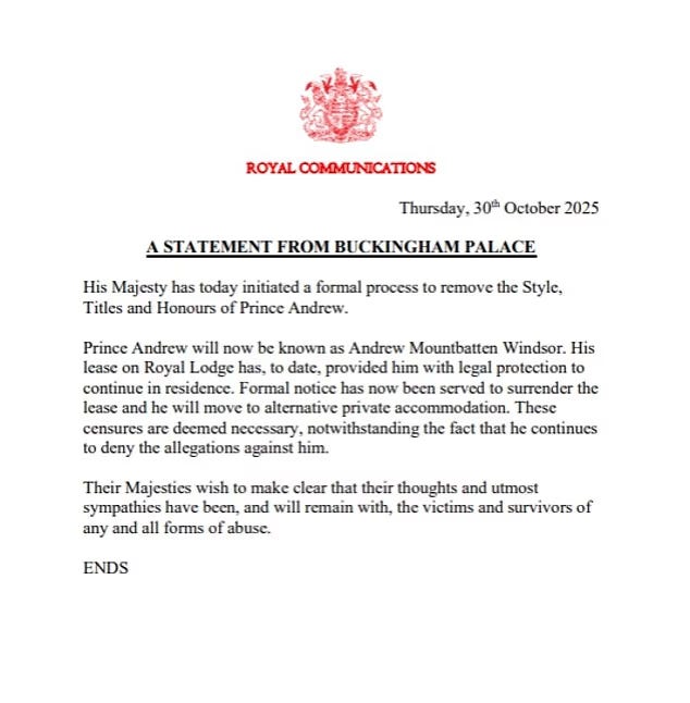 The announcement came thirteen days after Andrew’s own statement agreeing to “no longer use my title [Duke of York] or the honours which have been conferred upon me”: his position as a Royal Knight Companion in the Most Noble Order of the Garter that he had held since 2006 as well as his status as Knight Grand Cross of the Royal Victorian Order that Queen Elizabeth II had given him in 2011. I wrote about the background leading to these dramatic developments in The Downfall of Prince Andrewin Royals Extra on October 19. The most damning revelation was that Andrew had lied about ending his friendship with Epstein.
