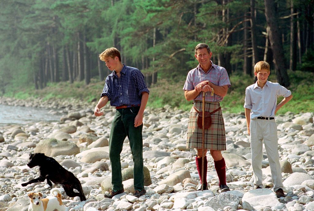 Then-Prince Charles In Kilt And Sporran And Shepherd's Crook Walking Stick With Prince William & Prince Harry At Polvier, By The River Dee, Balmoral Castle Estate in August 1997© Tim Graham, Getty