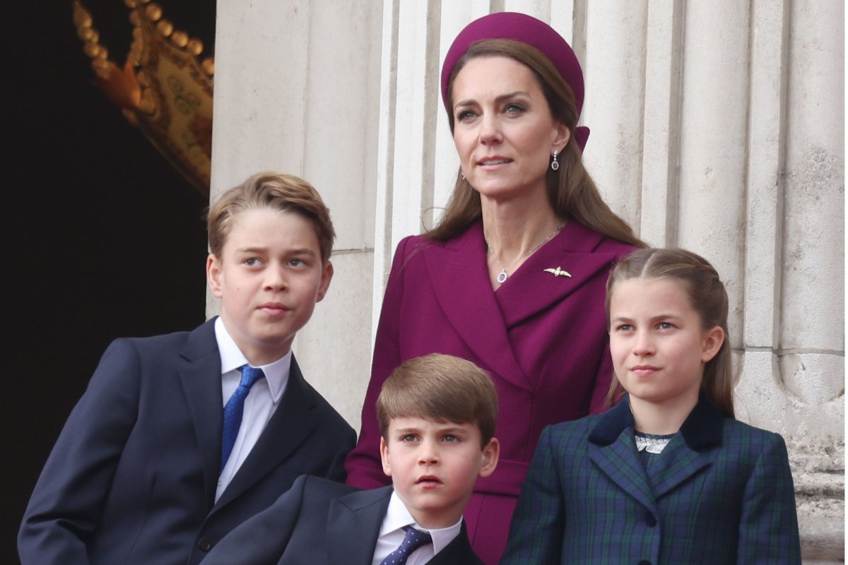 Princess Charlotte maintains her perfect posture while Prince George and Prince Louis lean across on the balcony of Buckingham Palace during the 80th anniversary of VE Day procession, in London, England, on May 5, 2025.