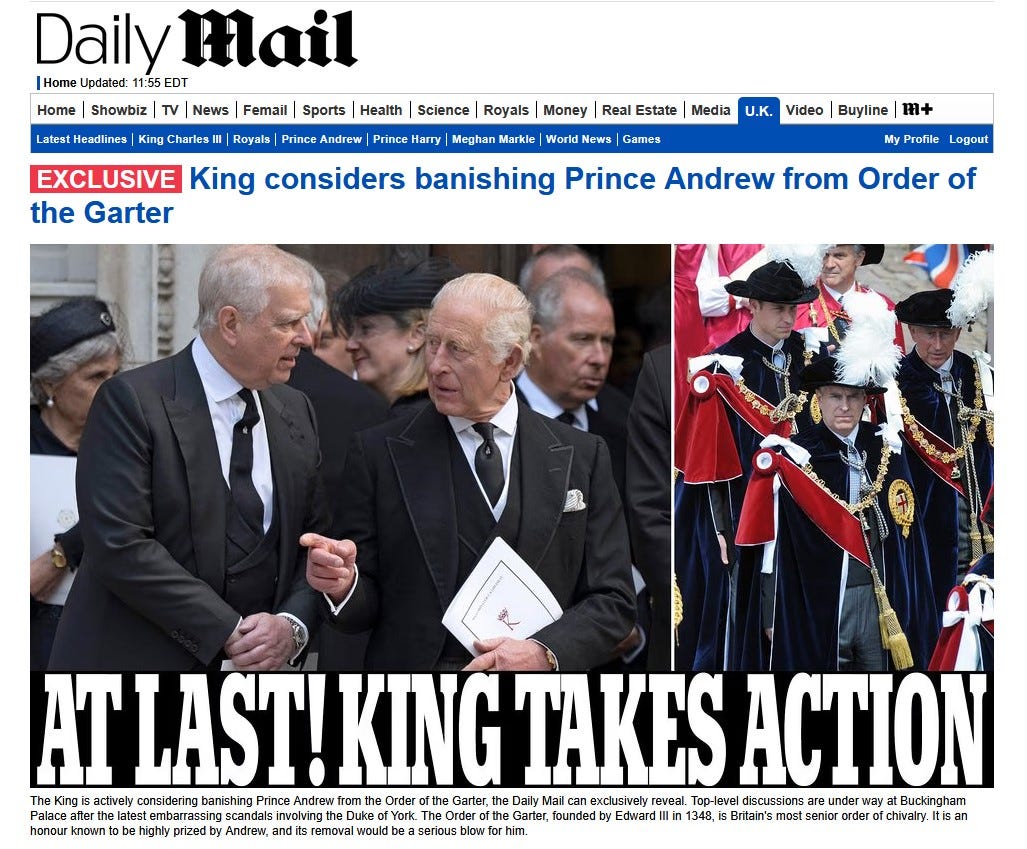 King considers banishing Prince Andrew from Order of the Garter by Mark Duell of the Daily Mail (5:07 p.m. BST): “The King is urgently and actively considering banishing Prince Andrew from the Order of the Garter, the Daily Mail can exclusively reveal. Top-level discussions are under way at Buckingham Palace after the latest embarrassing scandals involving the Duke of York. It is even possible there could be an official announcement later today. The Order of the Garter, founded by Edward III in 1348, is Britain’s most senior order of chivalry. It is an honour known to be highly prized by Andrew, and its removal would be a serious blow for him. The monarch can strip the honour from members of the order, although it is understood that Charles would much prefer his brother to voluntarily relinquish the title.’
