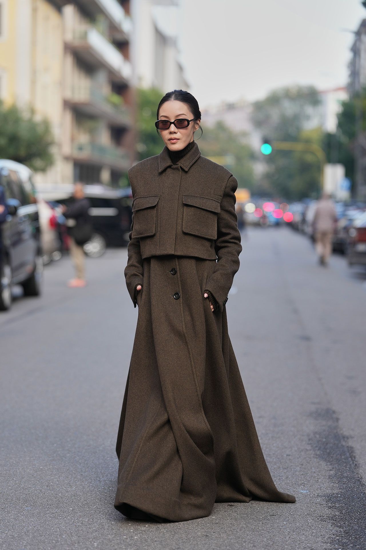 If you really want to commit, go for an olive green ensemble. You can find co-ords to suit your mood, from suits to skirt and jacket sets. Why not play with textures, too? Satin, wool, leather, corduroy… It will bring visual depth while retaining that minimal feel.