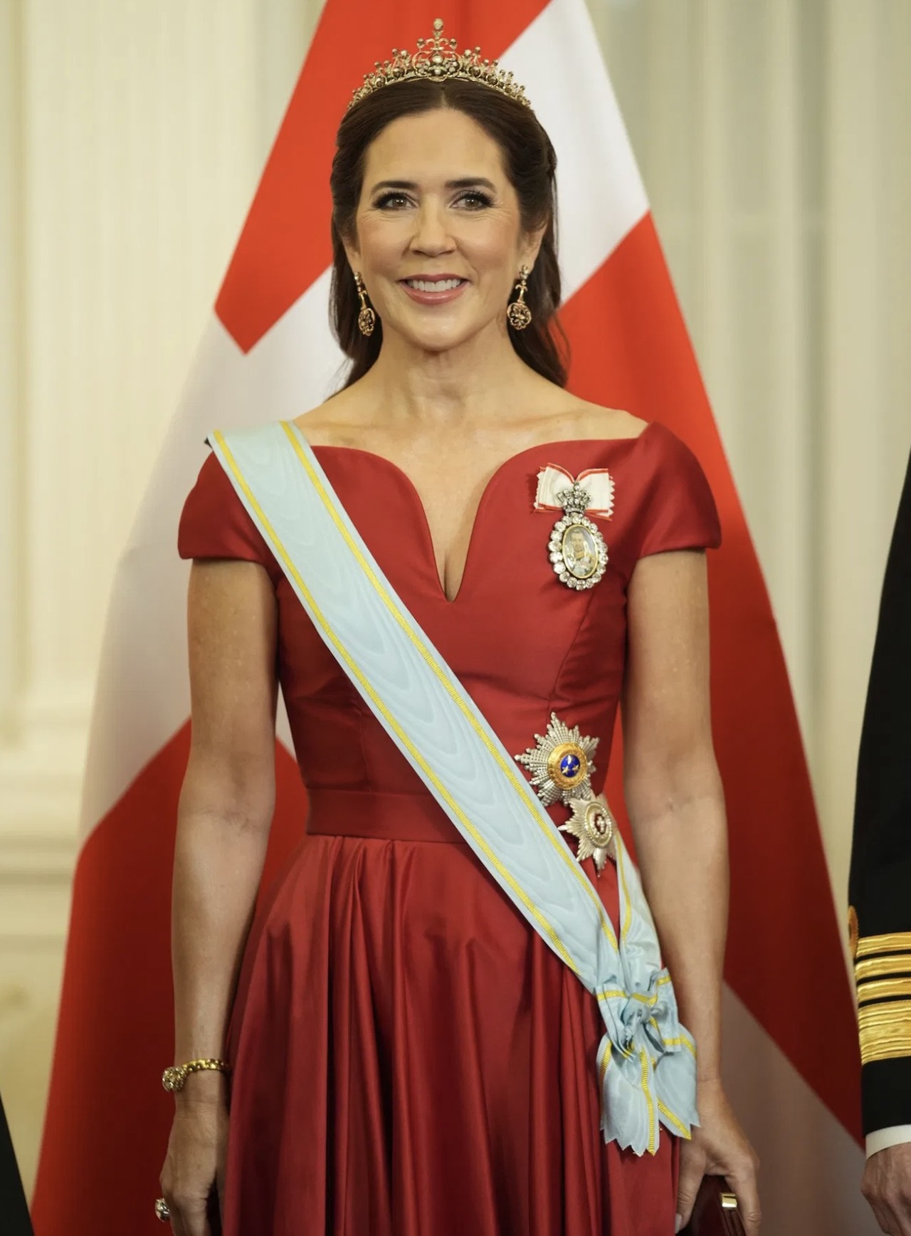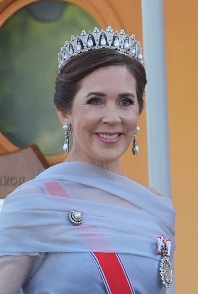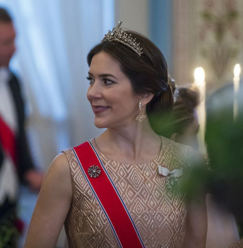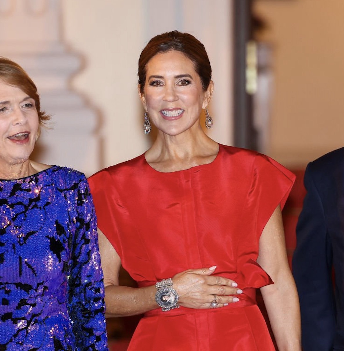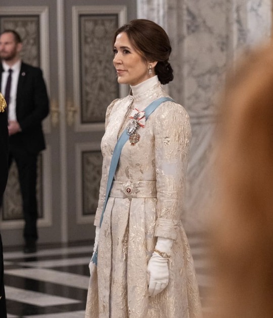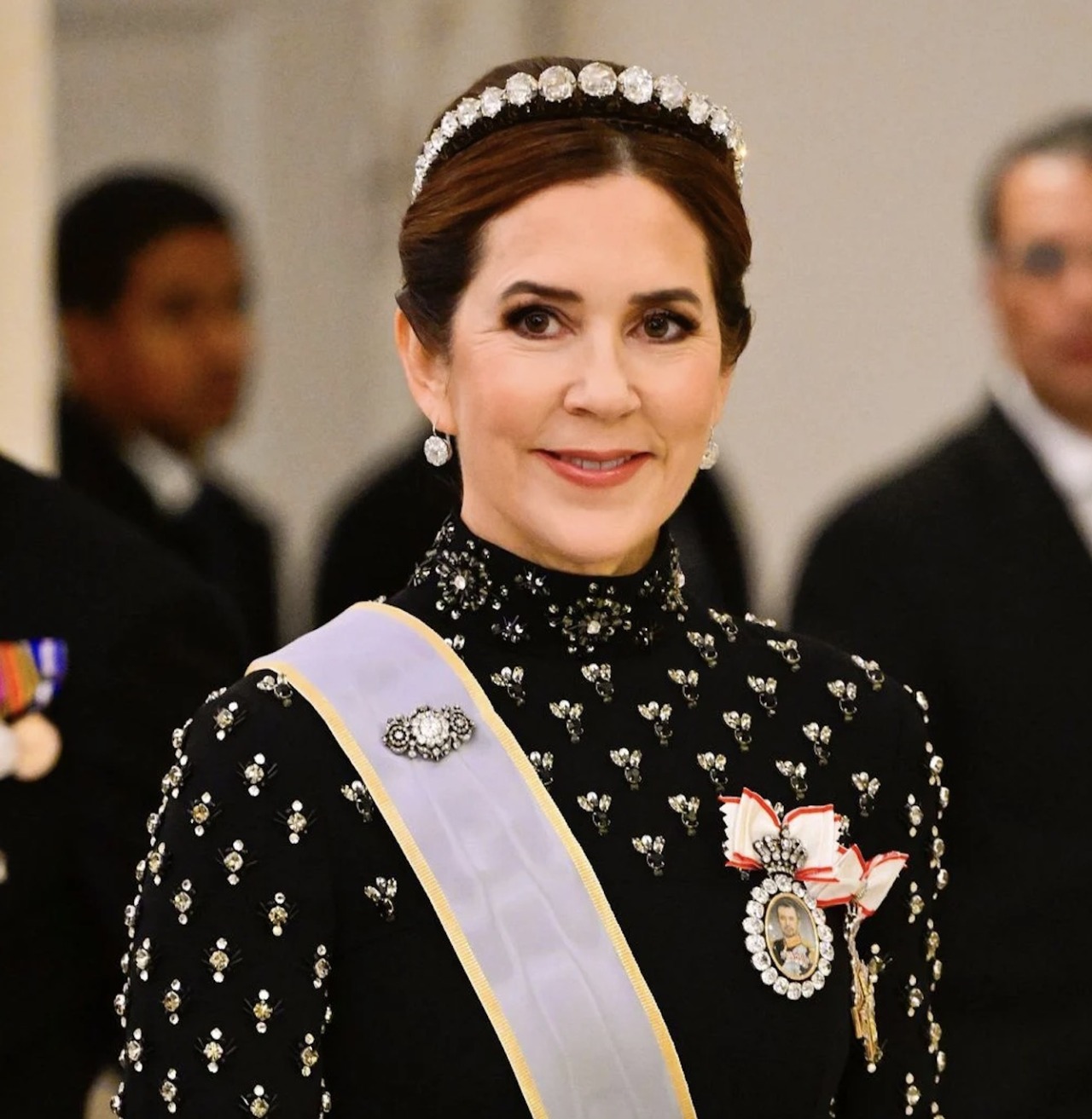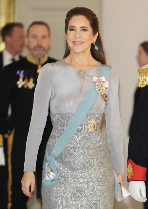 Queen Mary wore her Diamond Necklace Tiara and Diamond Earrings with Queen Louise of Sweden’s Engagement Bracelet, King Frederik X’s Portrait Order, and the Order of the Three Stars.