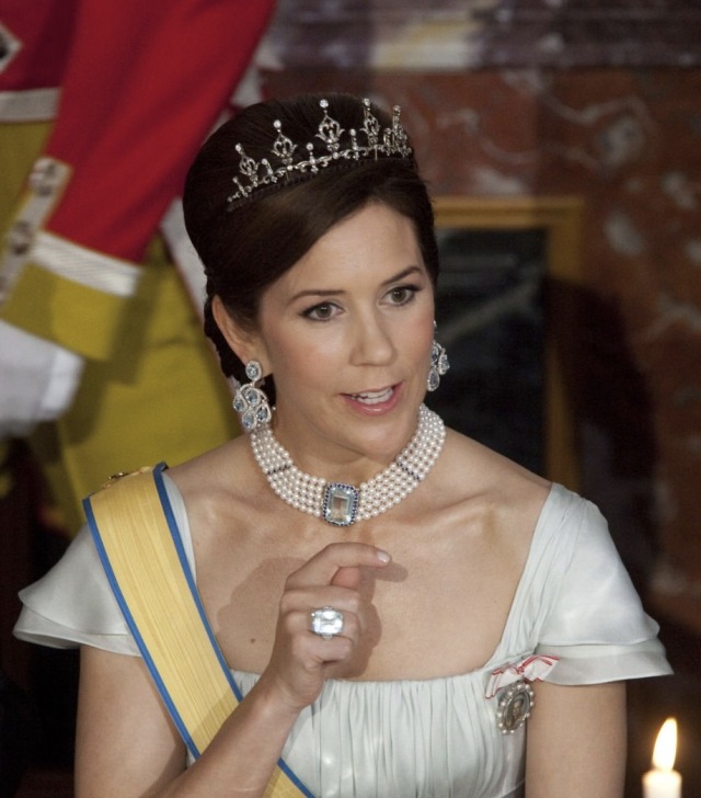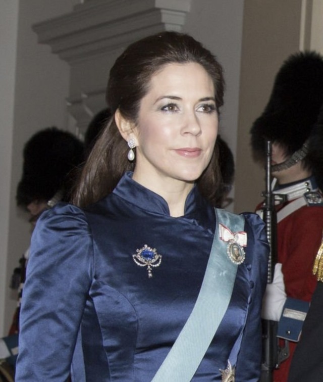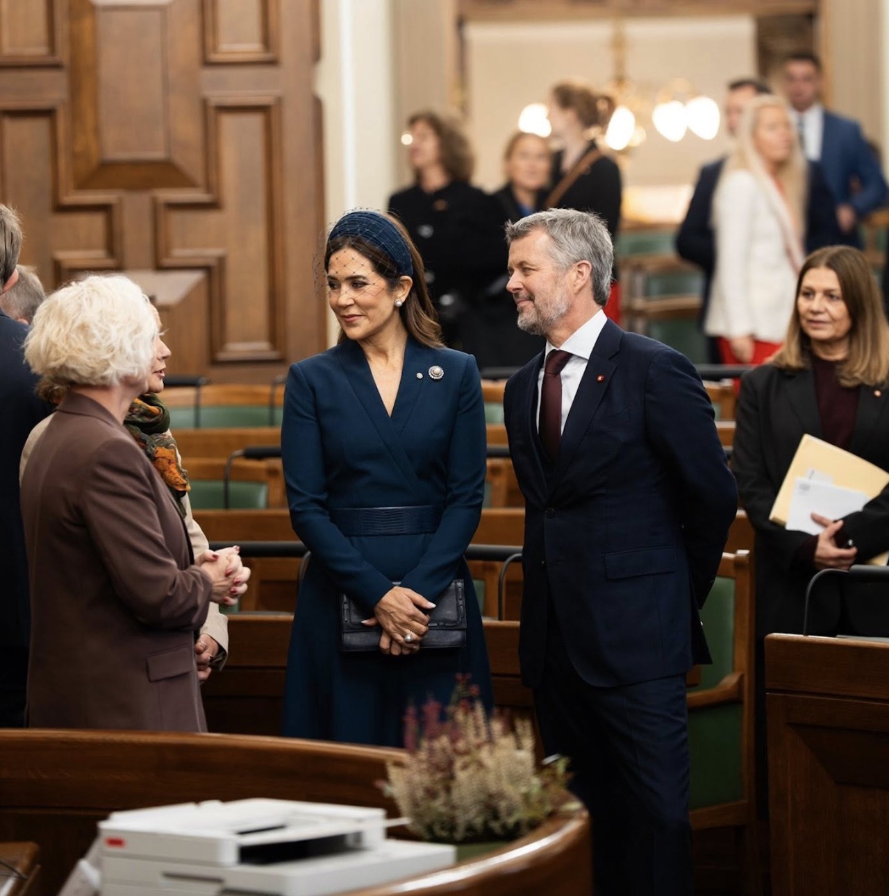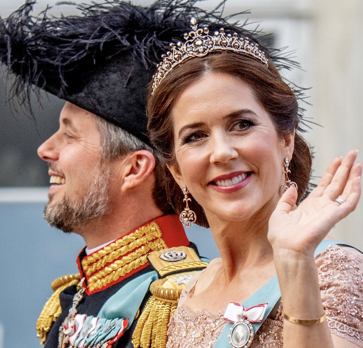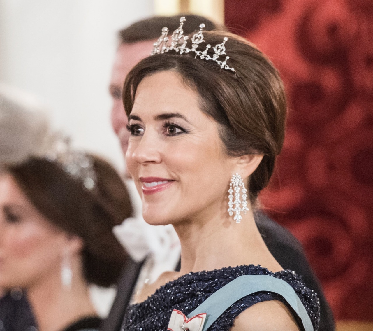 Queen Mary wore her Diamond Necklace Tiara and Diamond Earrings with Queen Louise of Sweden’s Engagement Bracelet, King Frederik X’s Portrait Order, and the Order of the Three Stars.