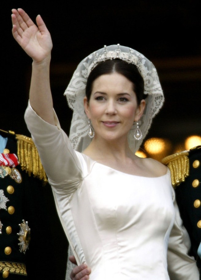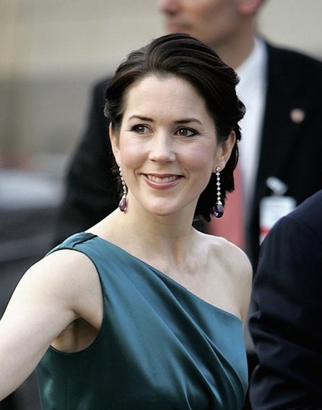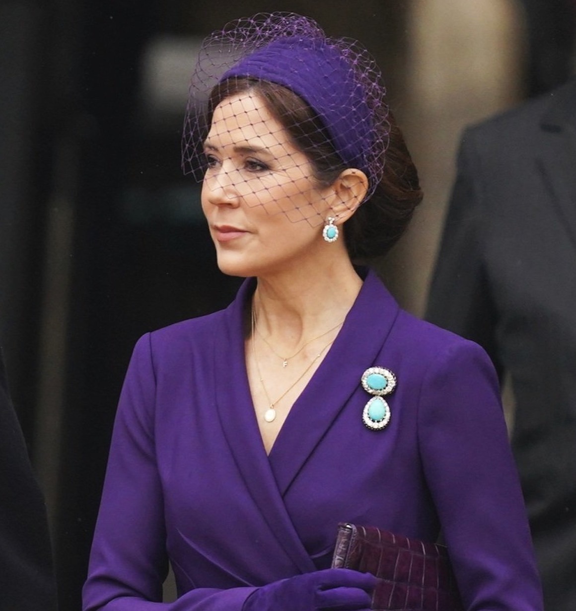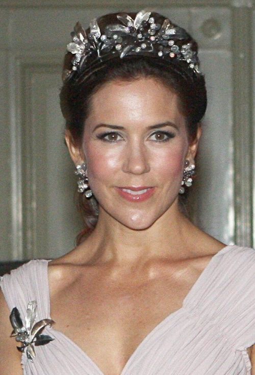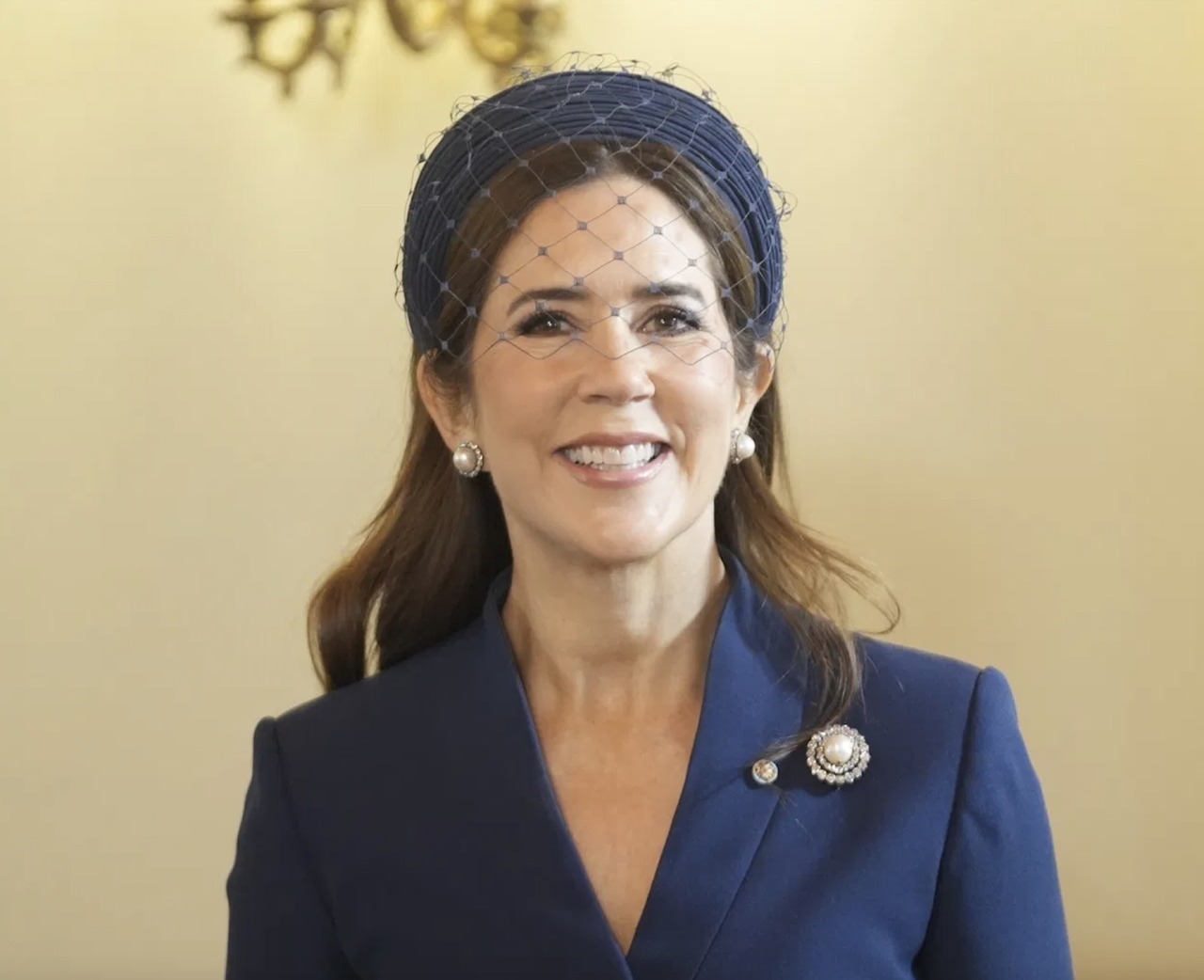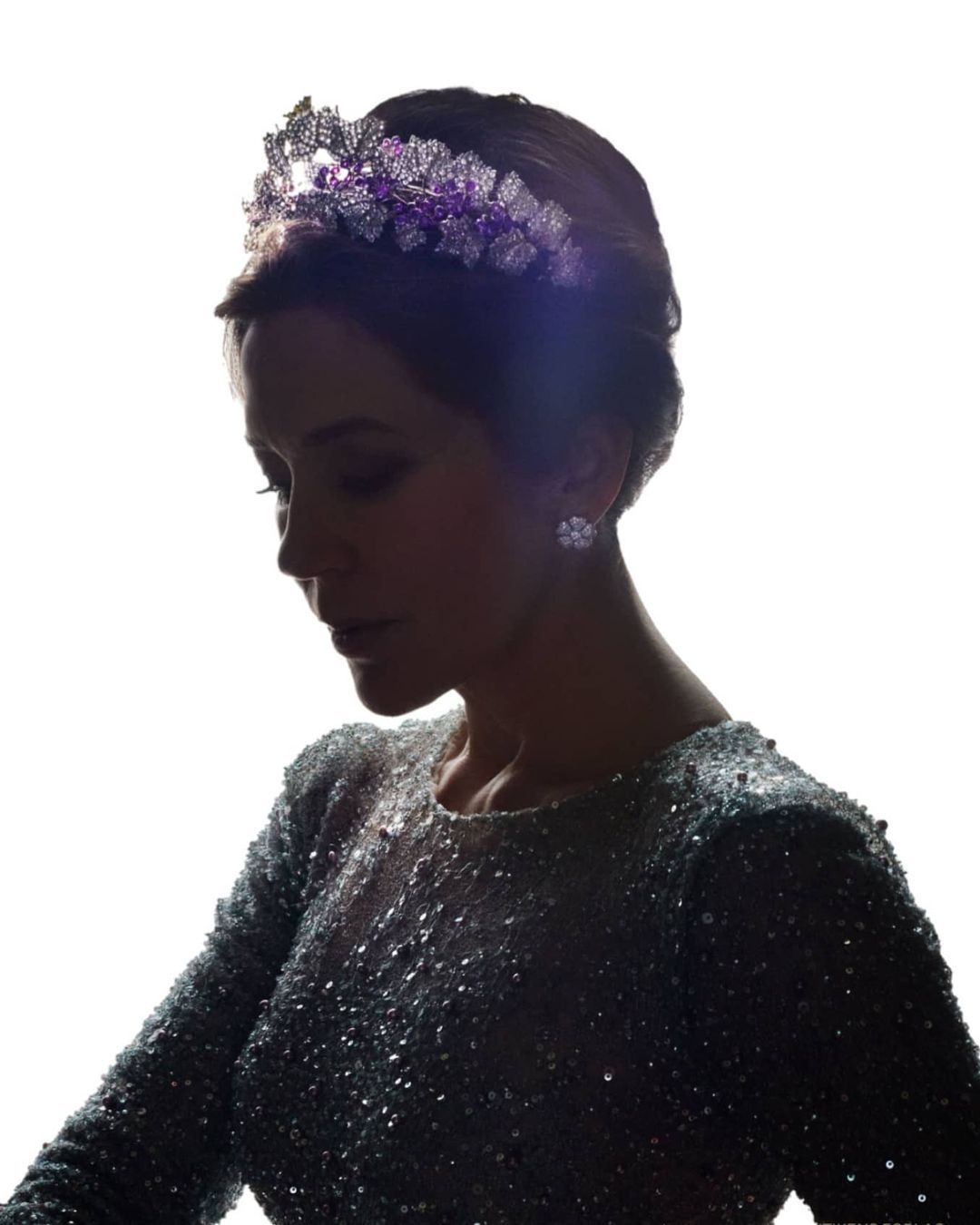 Queen Mary wore her Diamond Necklace Tiara and Diamond Earrings with Queen Louise of Sweden’s Engagement Bracelet, King Frederik X’s Portrait Order, and the Order of the Three Stars.