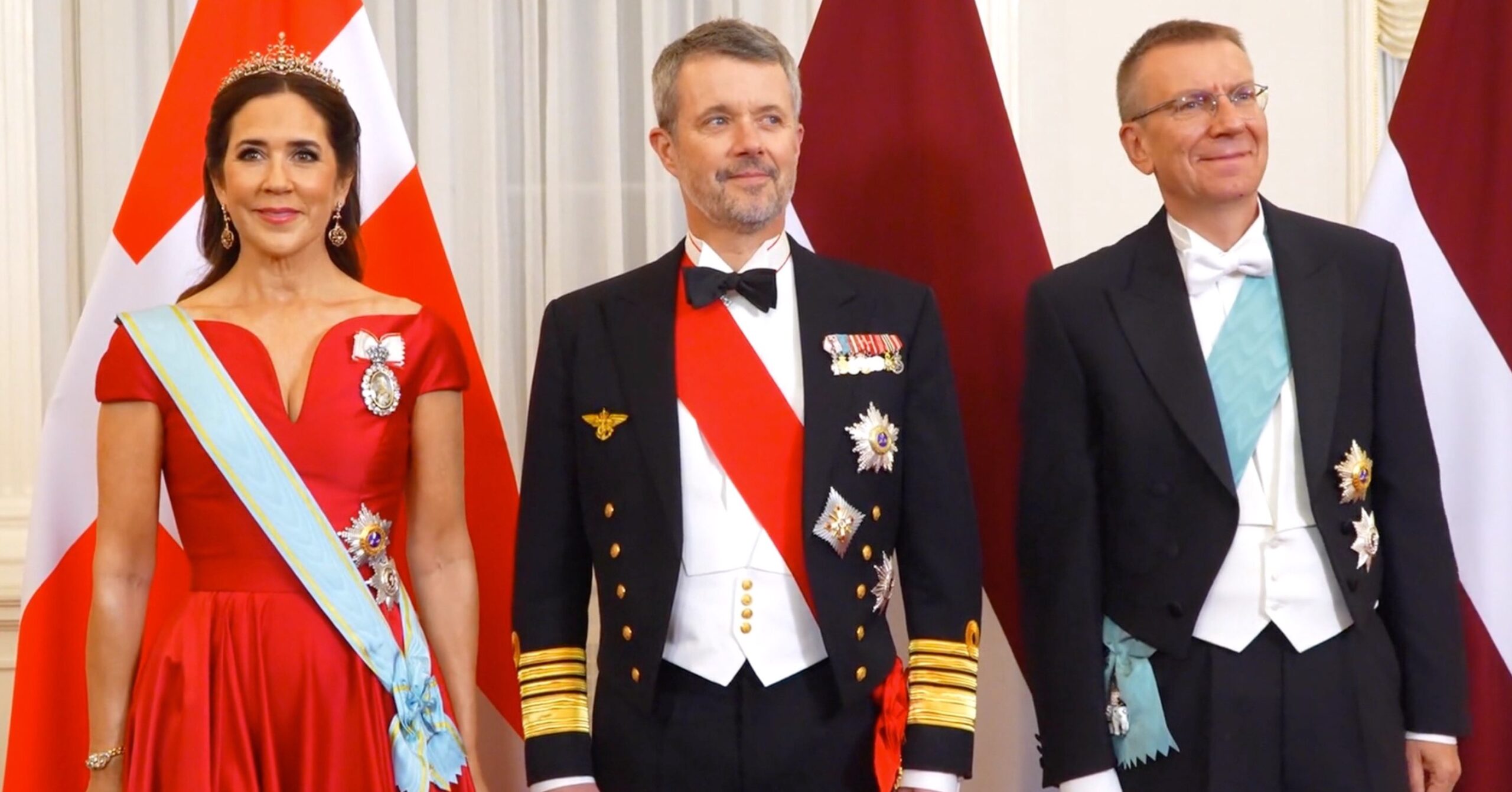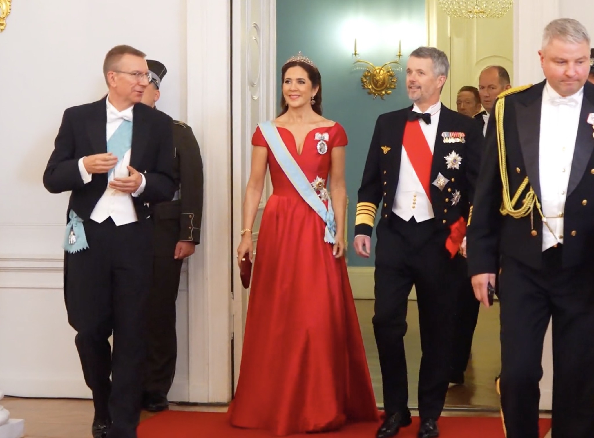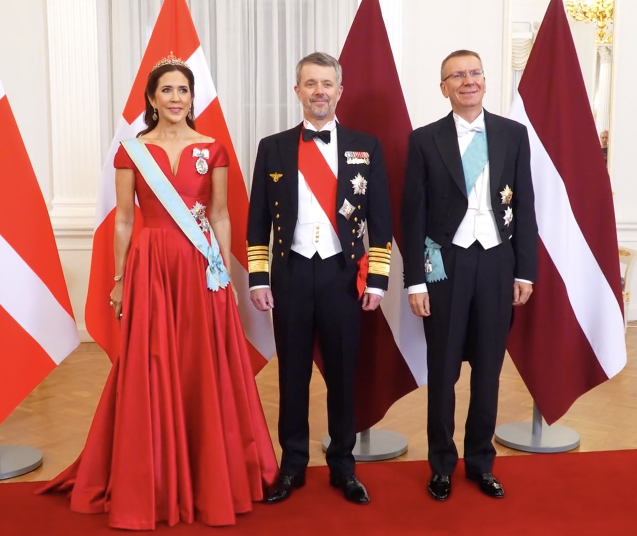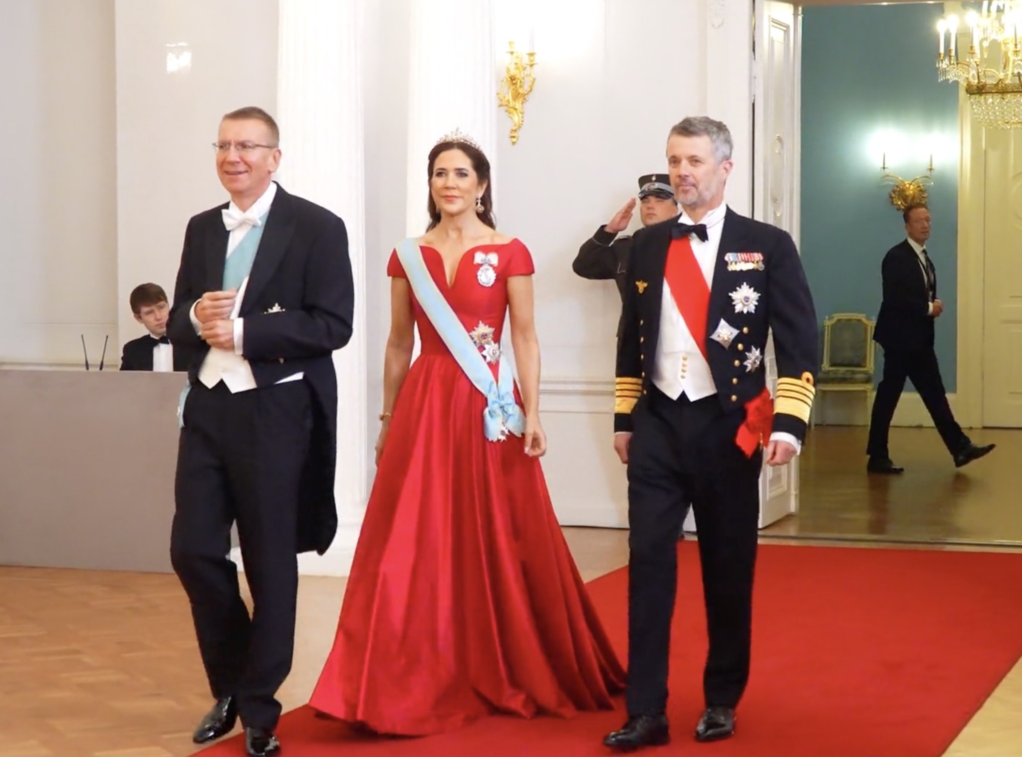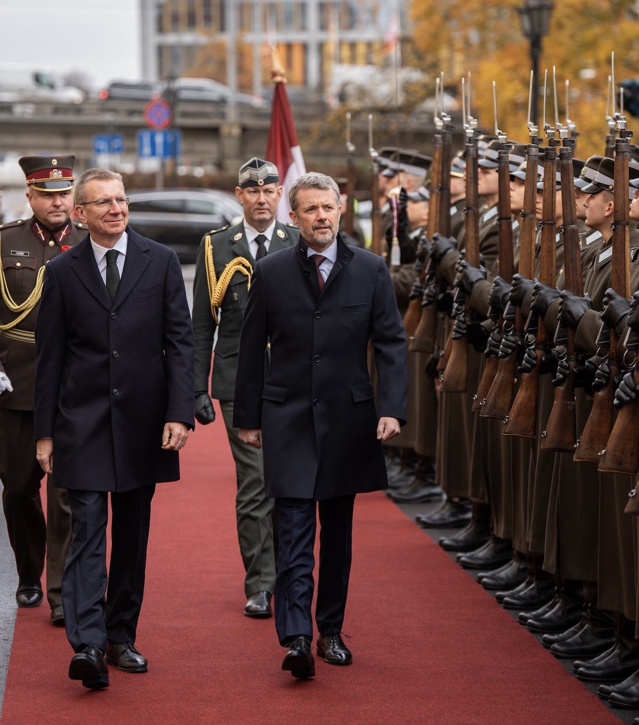 King Frederik X and Queen Mary were received by President Edgars Rinkēvičs in an Official Welcome Ceremony at Riga Castle, which included a ceremonial reception, an introduction of the countries’ official delegations, and an inspection of the guard of honour.