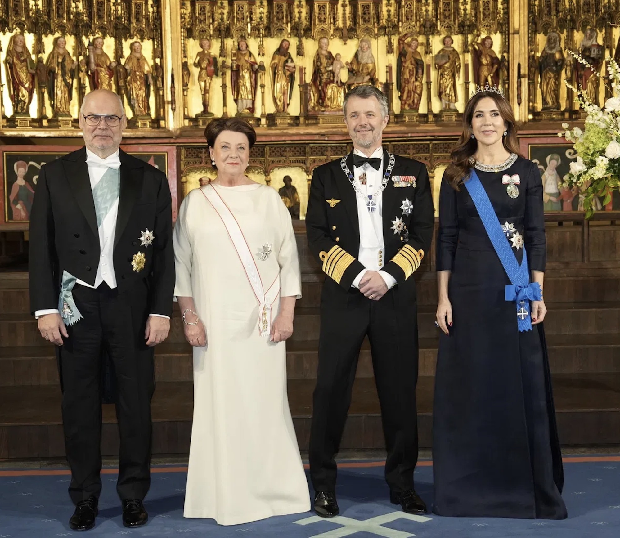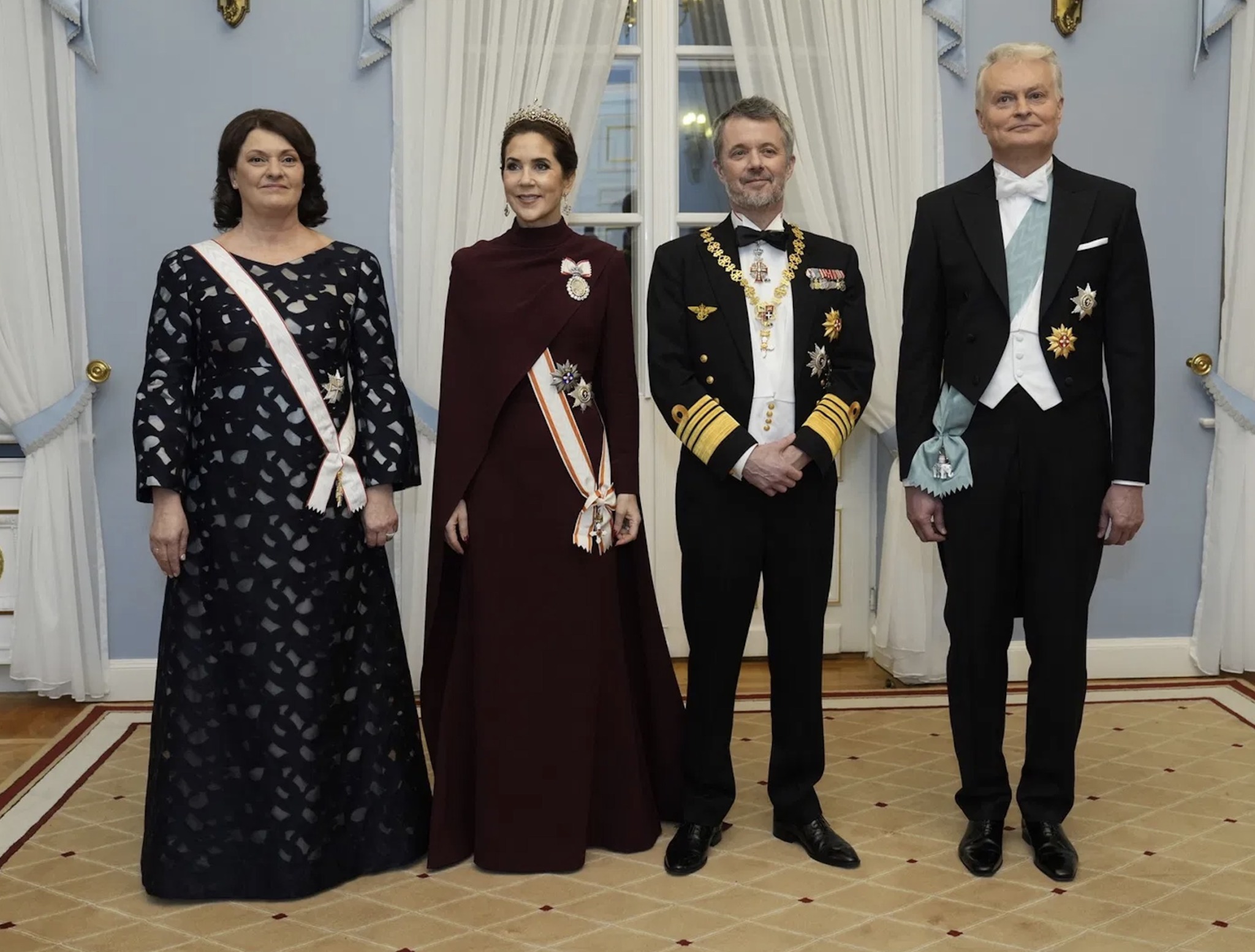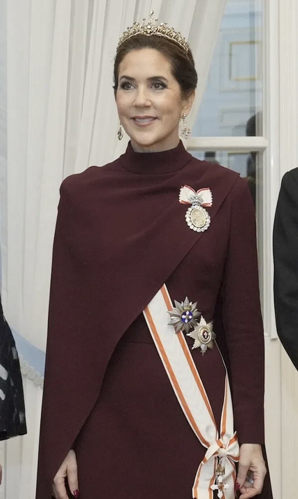 Queen Mary wore her Diamond Necklace Tiara and Diamond Earrings with King Frederik X’s Portrait Order, and the Grand Cross of the Order of Vytautas the Great.
