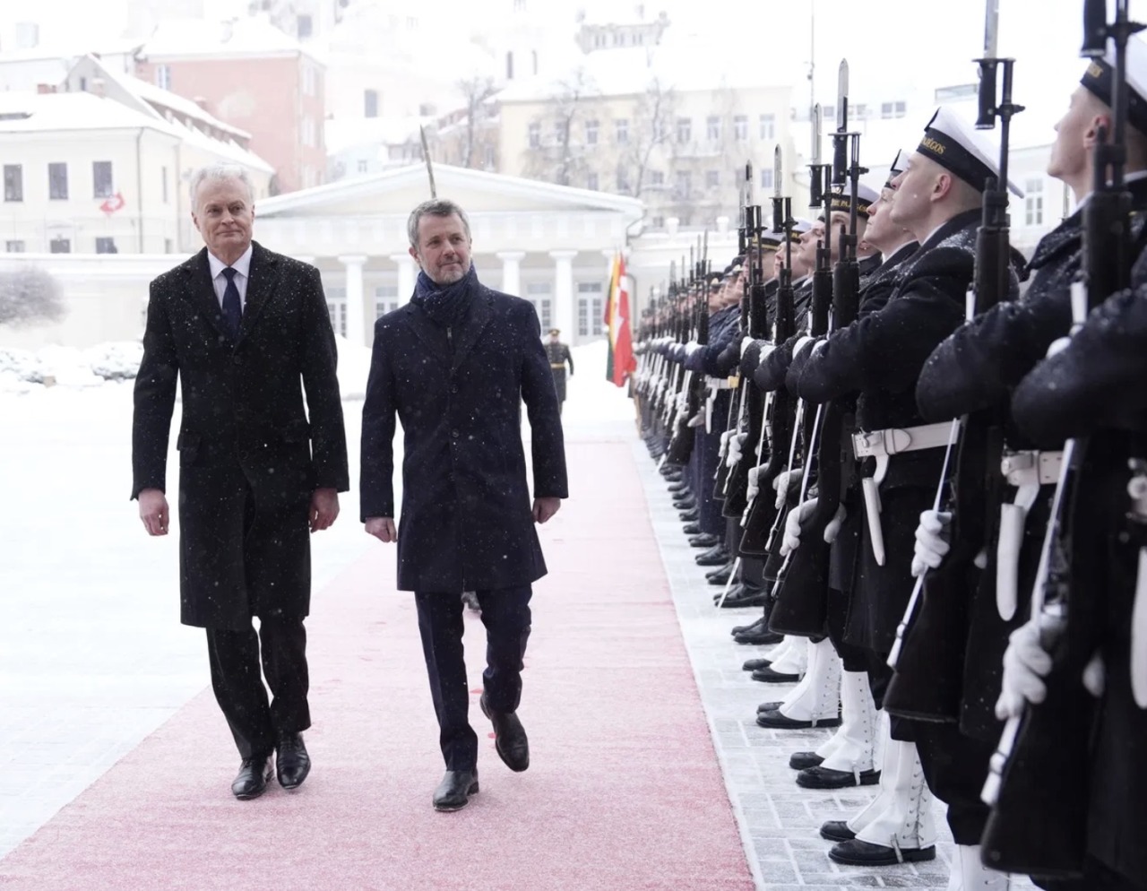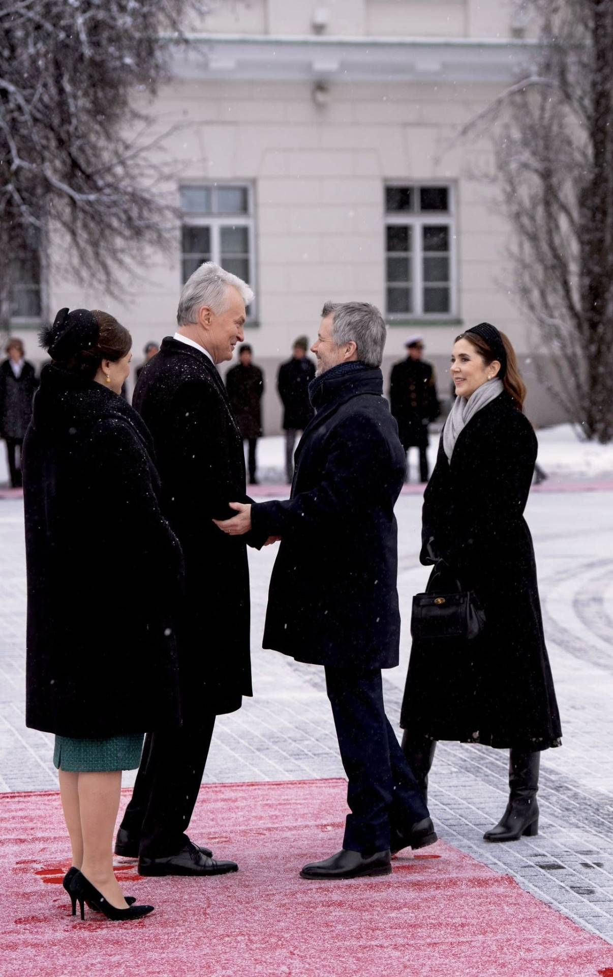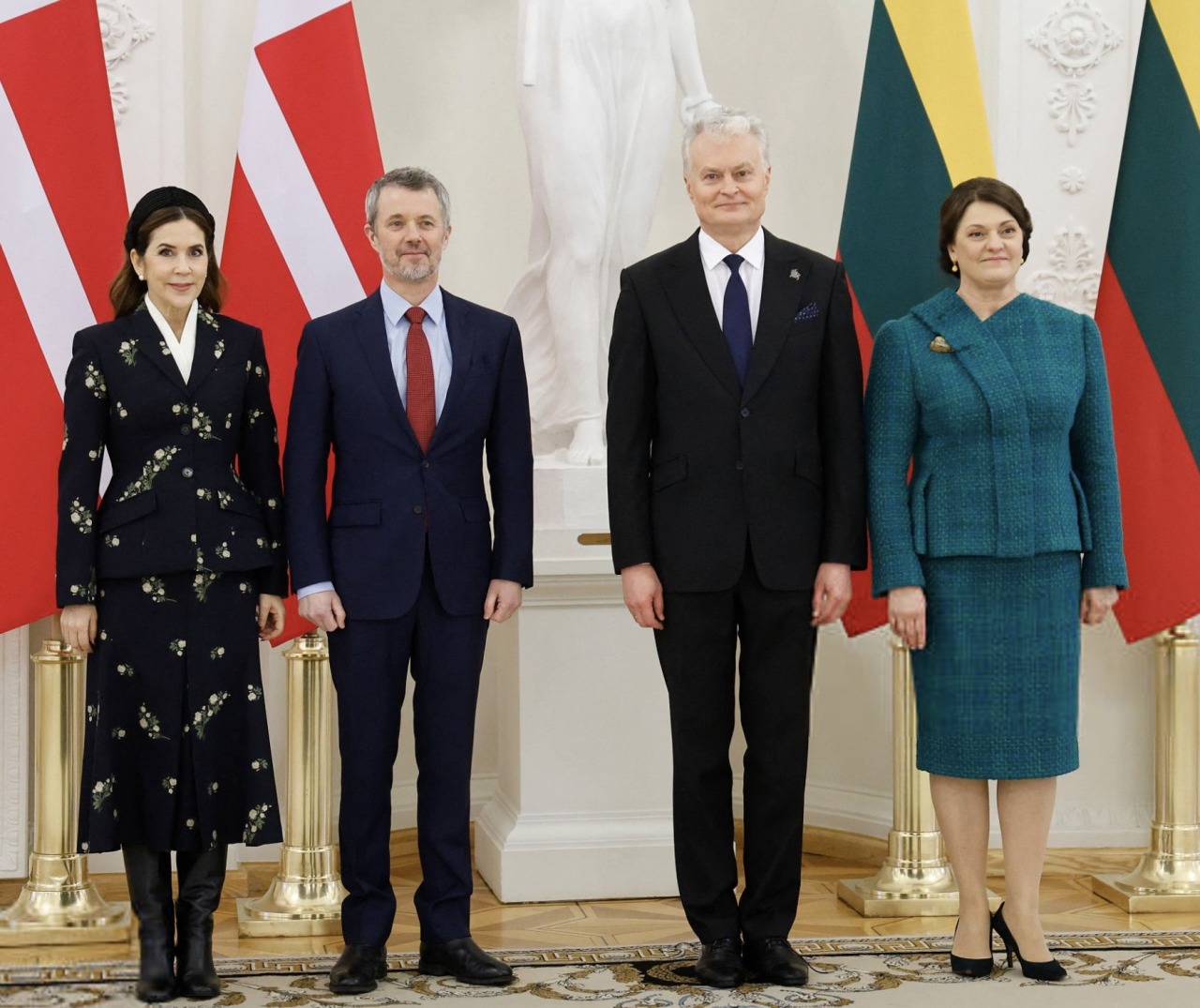 King Frederik X and Queen Mary were received by President Gitanas Nausėda and First Lady Diana Nausėdienė in an Official Welcome Ceremony at the Presidential Palace in Vilnius, followed by an extended meeting between the Lithuanian and Danish delegations.