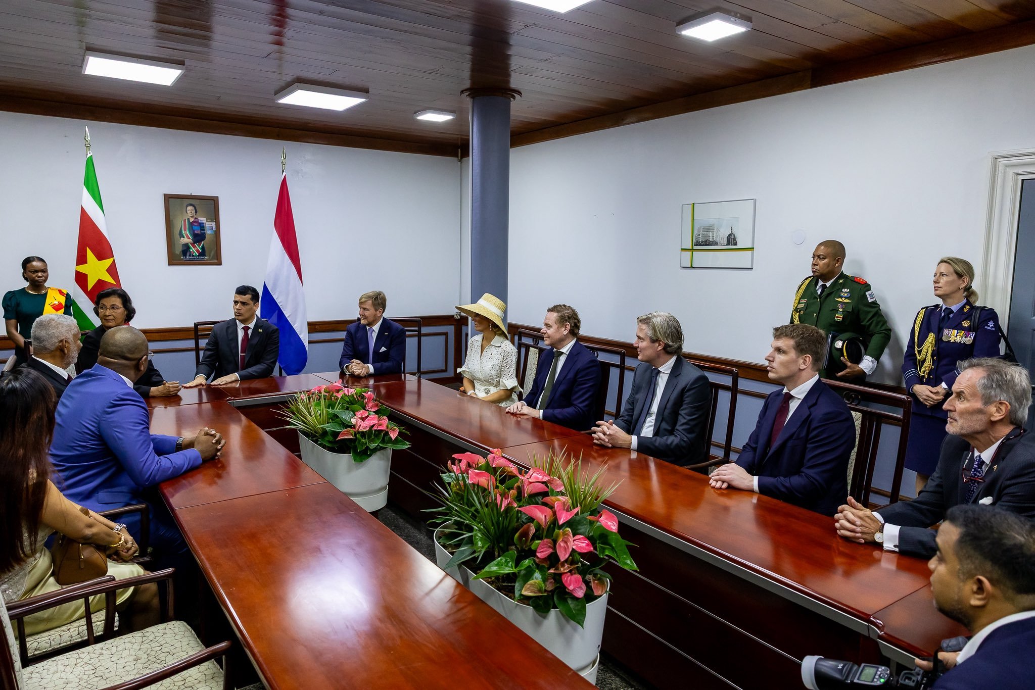 President Simons and her husband King Willem-Alexander and Queen Máxima welcomed the Royal Couple at the Presidential Palace with an official welcome ceremony, followed by a tête-à-tête, ahead of talks with the Surinamese president and her ministers.