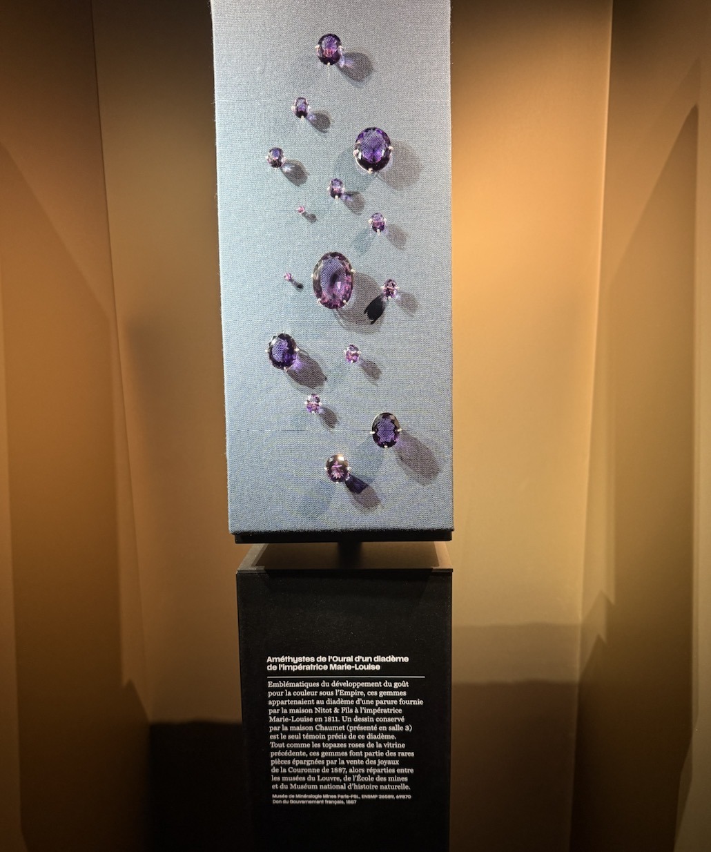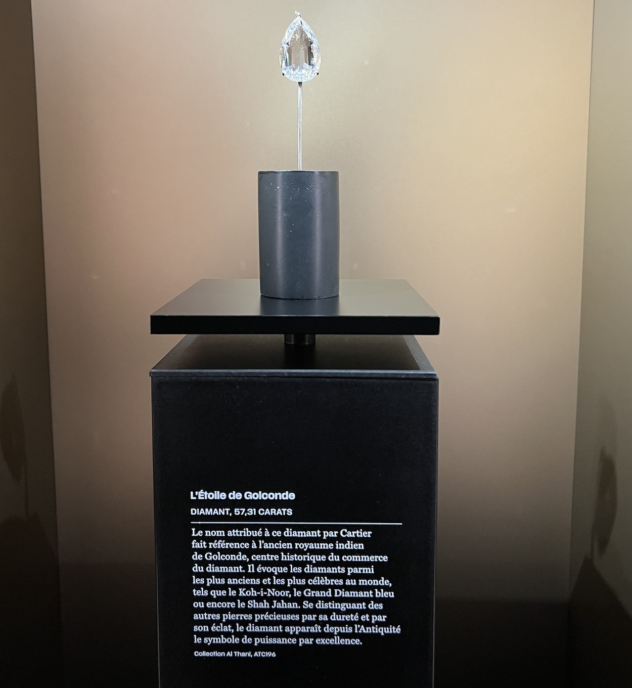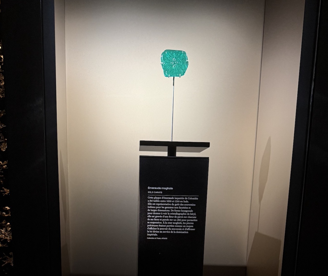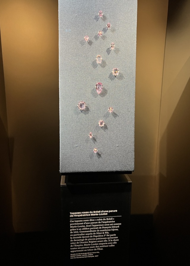 The Exhibition begins with a display of some of the most magnificent stones, which include the Briolette of India, the Star of Golconda Diamond, two Mughal Emeralds, and loose topazes and amethysts once belonging to Empress Marie Louise.