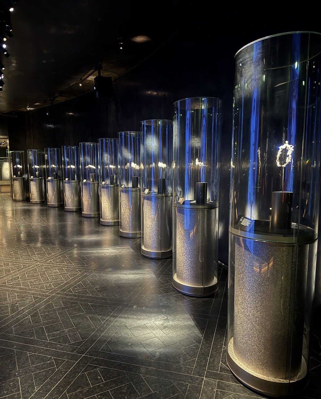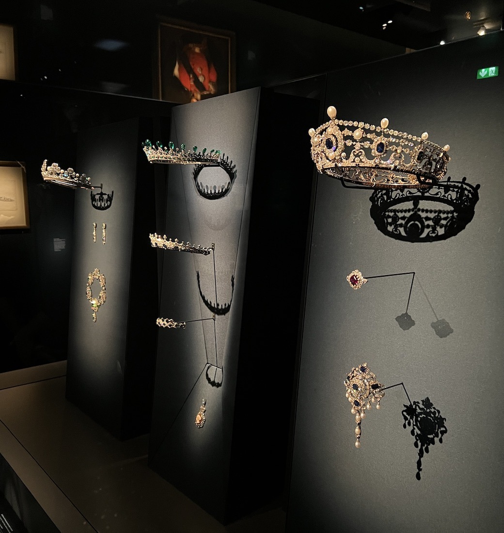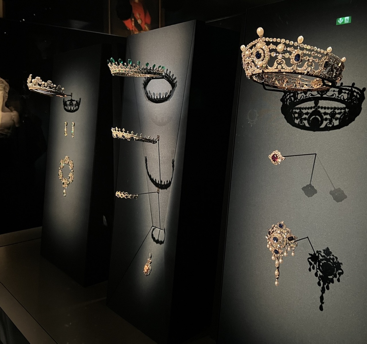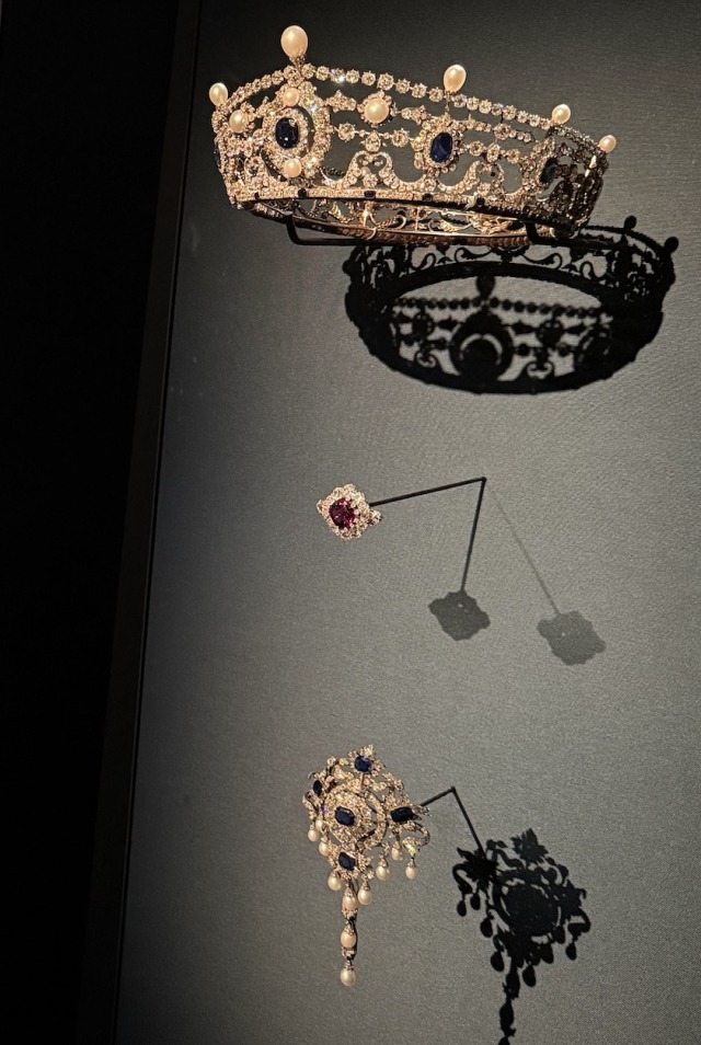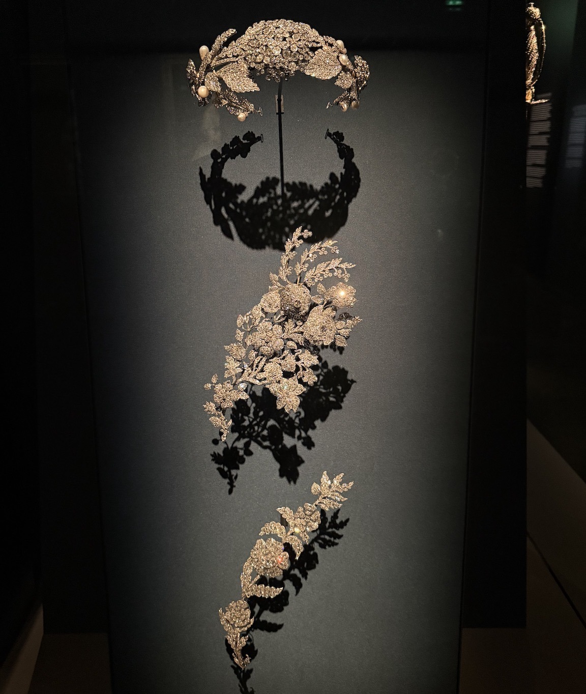Then we move into the spectacular gallery which has a display of eleven Tiaras, in chronological order, on loan from the Victoria and Albert Museum and the Chaumet and Cartier Collections alongside the Al Thani Collection.