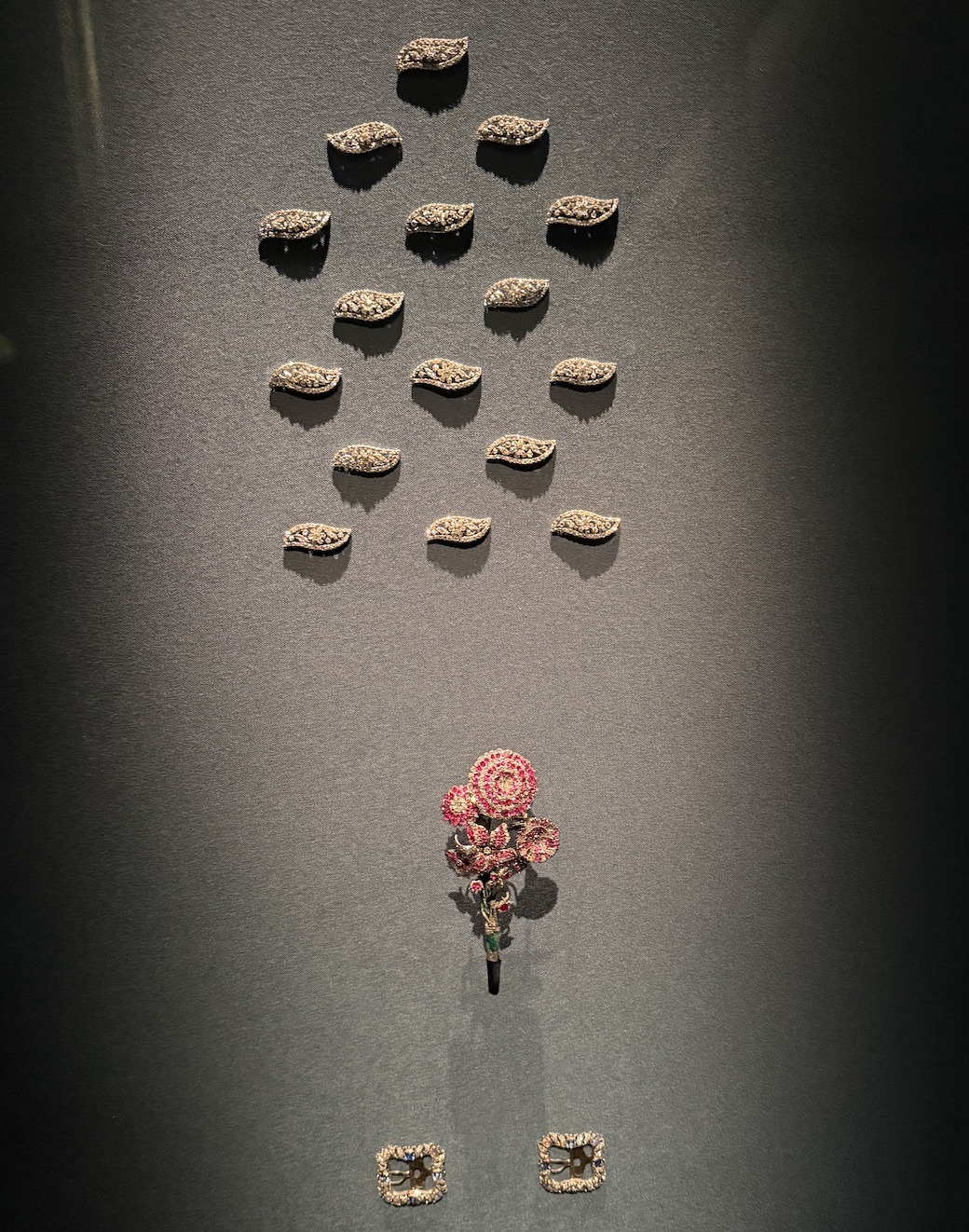 The last case in the room features the jewels of the French Second Empire, among them Princess Mathilde Bonaparte’s massive Diamond Rose Brooch, Empress Eugénie’s Mellerio Feather Brooch and a pair of Pearl and Diamond Earrings also from Empress Eugénie. The case also has several brooches and ornaments from the Al Thani and the V&A collection.
