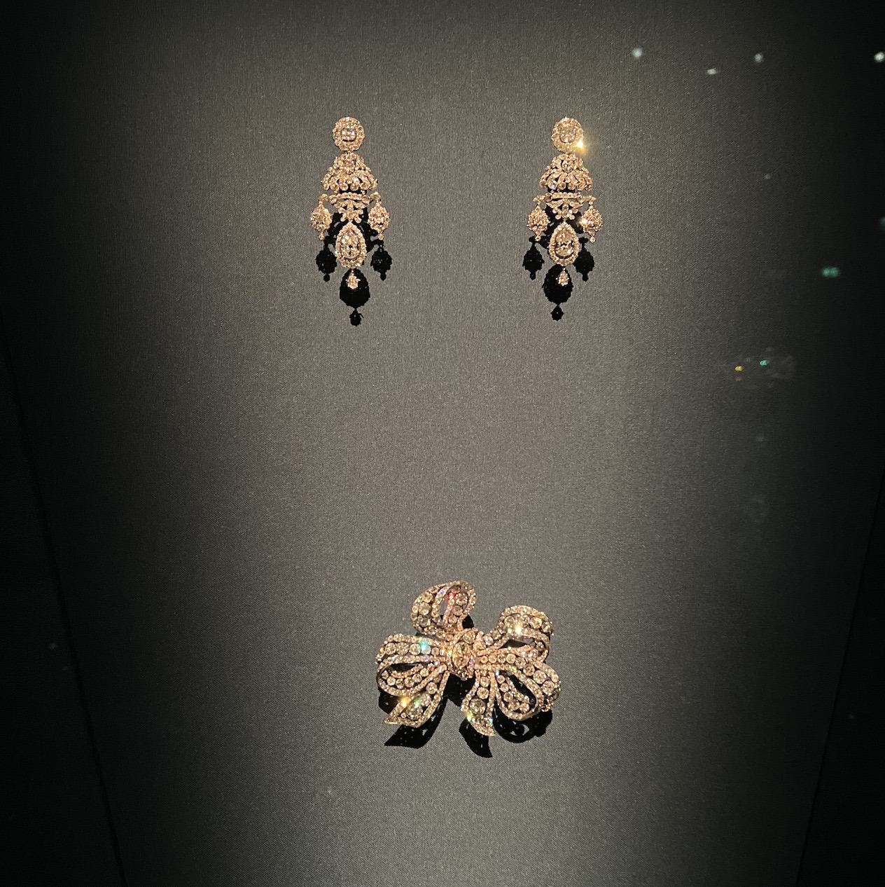 Most notable are Princess Marina’s Diamond Bow Brooch and Diamond Girandole Earrings, which both now belong to the Al Thani Collection. Beside that is the Londonderry Topaz Brooch and a Pendant from the V&A which was given by Queen Mary.
