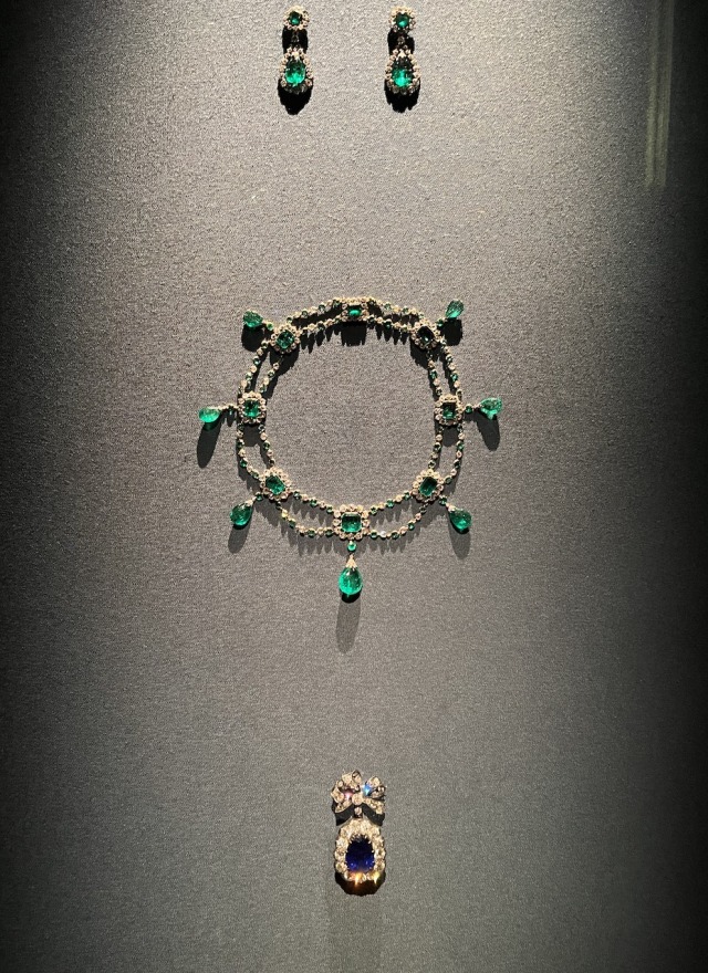 You begin with the magnificent Emerald Necklace and Earrings made by Nitot for Stéphanie de Beauharnais, Grand Duchess of Baden which is in the V&A, alongside a massive Sapphire and Diamond Brooch from the Al Thani Collection which supposedly originates from Empress Josephine.
