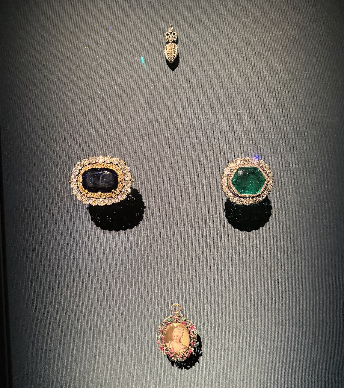 On the side is the Seringapatam Emerald Parure, which was part of the loot of Major-General George Harris, the 1st Baron Harris, following the defeat of Tipu Sultan of Mysore in 1799.