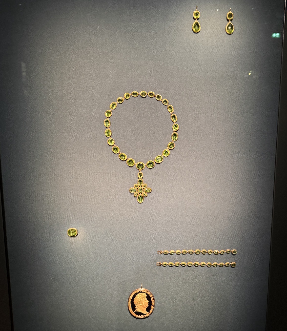 The next case displays a Peridot Parure given by King George IV, alongside several jewels, brooches and miniatures all from the V&A collection.