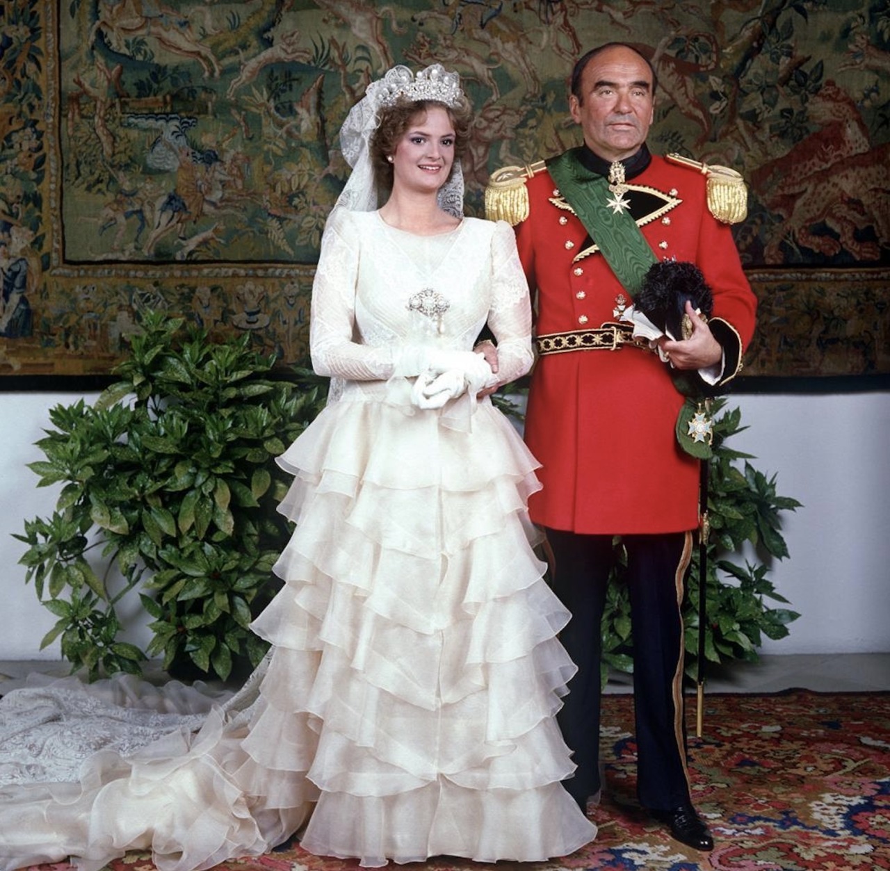 In 1980, Empress Eugénie’s Pearl Tiara was worn by Countess Gloria von Schönburg-Glauchau when she married Johannes, the 11th Prince of Thurn und Taxis at Saint Emmeram’s Abbey in Regensburg.