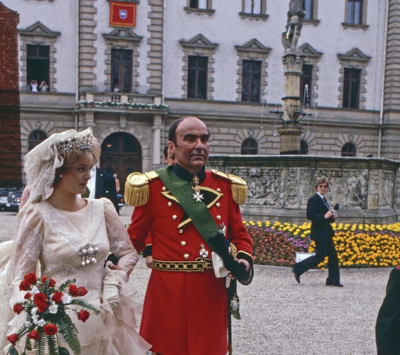 Usually you get married where the girl comes from, but since my father has only a villa in Munich (the Schönburg-Glauchau Seat of Schloss Rochsburg was on the other side of the Iron Curtain and not returned to the family until 1991), it was much nicer to do it at Regensburg. It was an incredibly grand party. Johannes’s friends came from all over the world. I wore a couture gown by Valentino, topped by Marie Antoinette’s diamond crown (she actually wore Empress Eugénie’s Pearl Tiara). It was really something to see. Half the Rothschilds were there, and then all those Prussian Counts and Barons covered with medals and Iron Crosses.”