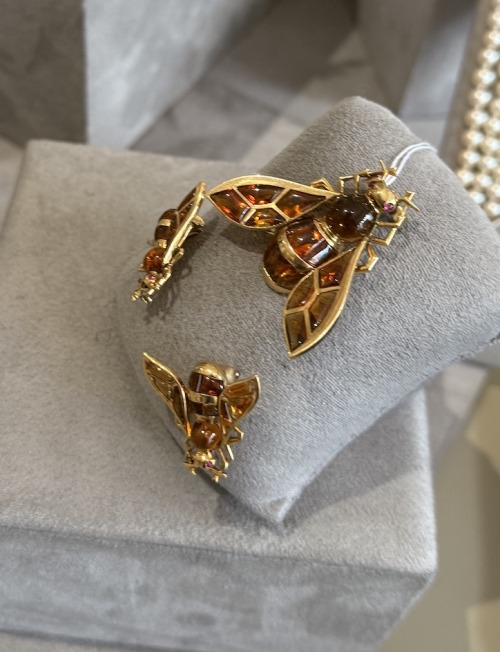 A set of citrine bee brooches, each stylised bumblebee set with a circular cabochon citrine thorax, with calibré-cut citrines to the abdomen and wings, and circular cabochon ruby eyes.