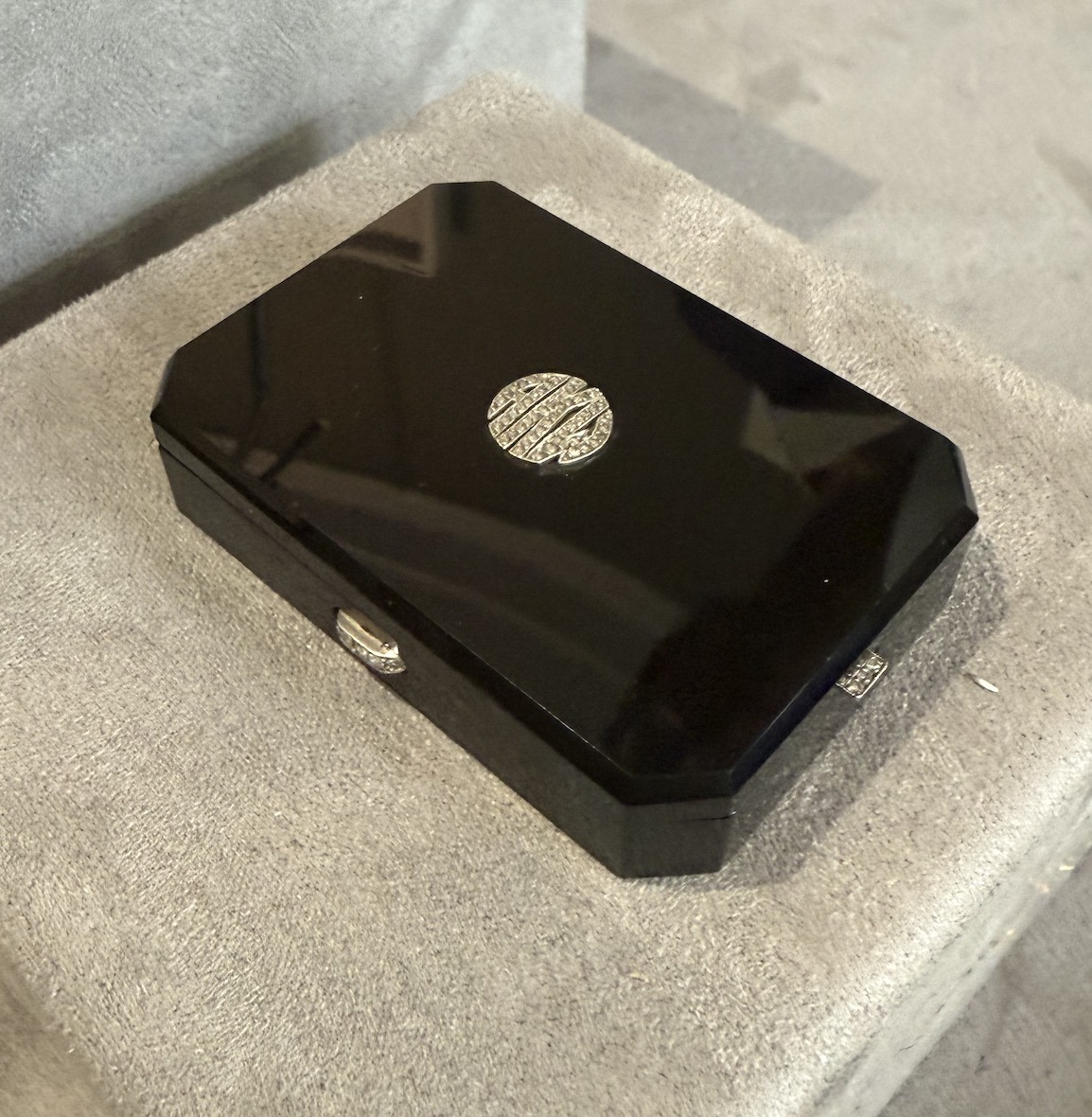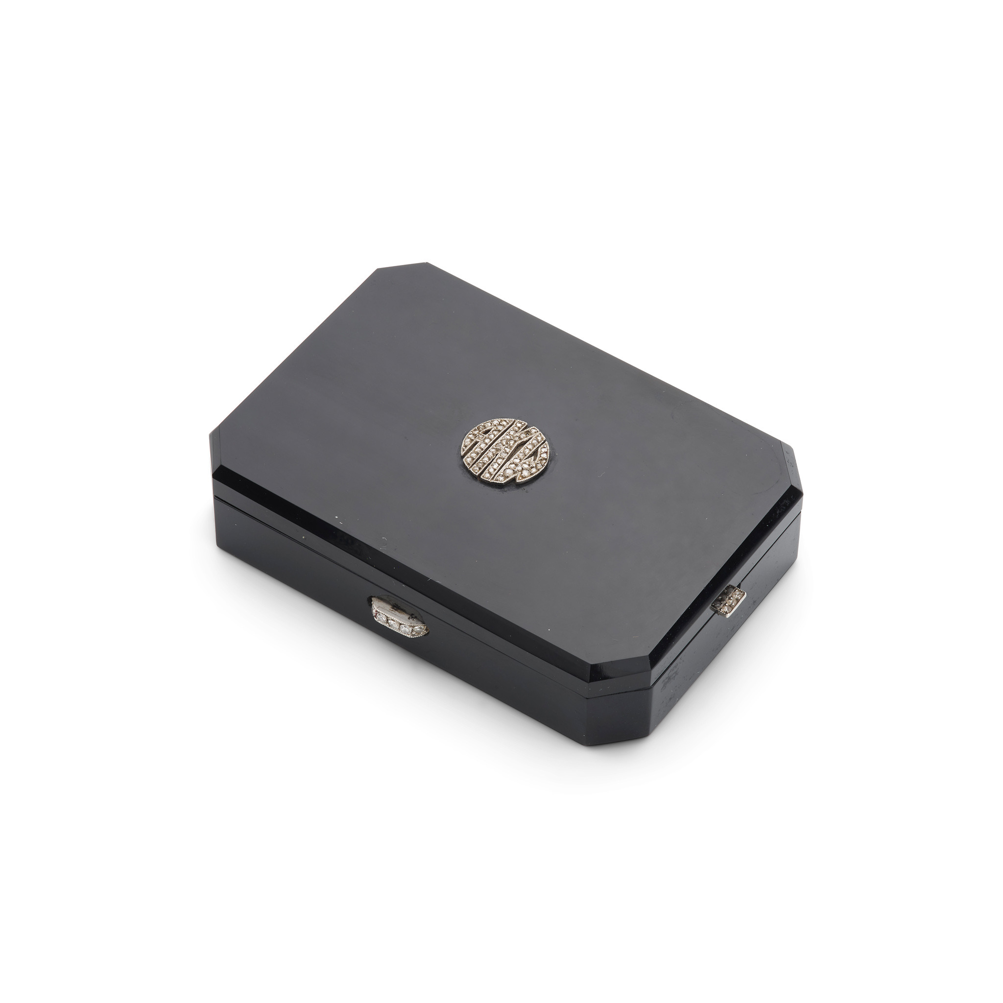 An Art Deco Diamond-Set Vanity Case, circa 1925, the lid of the onyx case set with the rose-cut diamond initials “AKW”, with a single-cut diamond push piece, opening to reveal a mirror and two internal compartments, the lids finely engraved and with rose-cut diamond tabs.