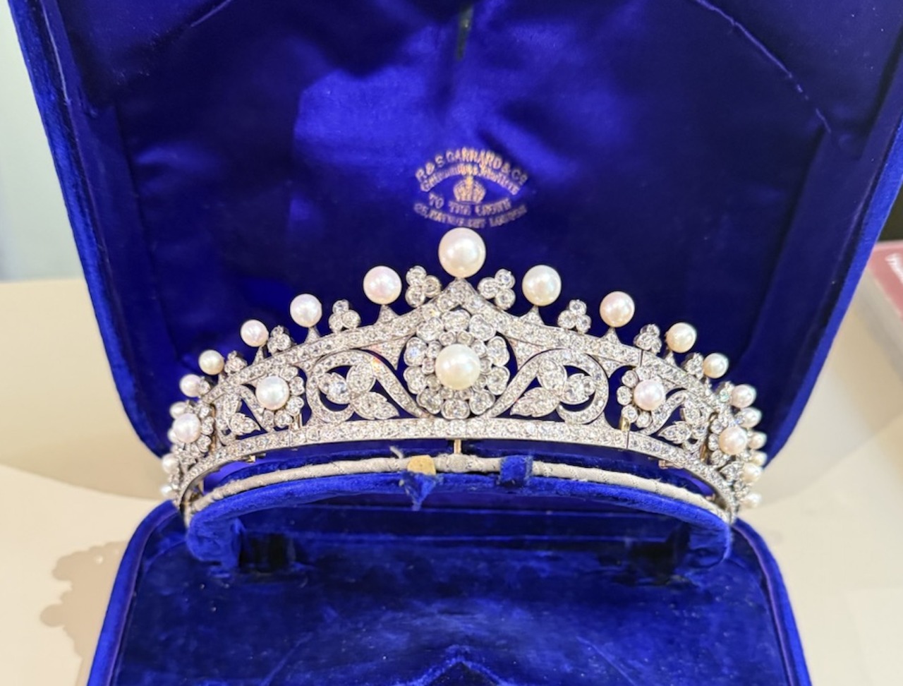 The Airlie Tiara was made towards the end of the 19th century and was first worn by Mabell, Countess of Airlie. In 1901 she was made Lady of the Bedchamber to the then Princess of Wales, later to become Queen Mary. Queen Mary had a particularly notable jewellery collection, including several significant tiaras and diadems. Some of which were inherited, others she commissioned, including from Garrard, the Crown Jewellers.