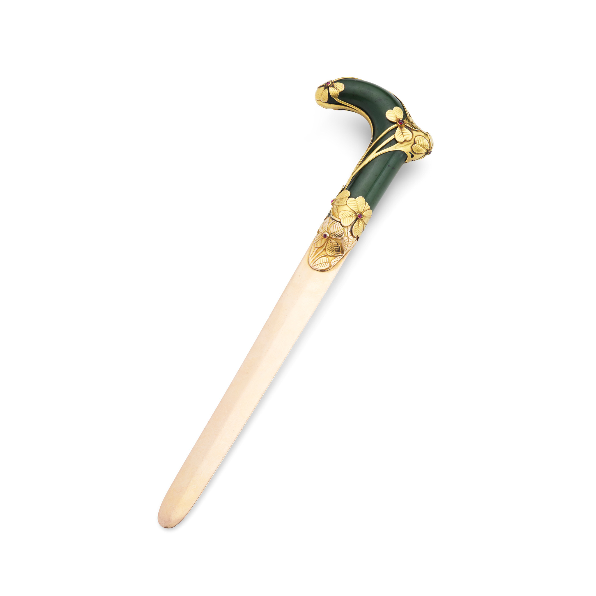 A Fabergé Nephrite and Ruby Objet, circa 1900, originally a carved nephrite cane handle, decorated with realistically formed four-leaf clovers, each inset with a circular cabochon ruby, to a later polished blade, workmaster’s marks for Michael Perchin, later converted to a paper knife.