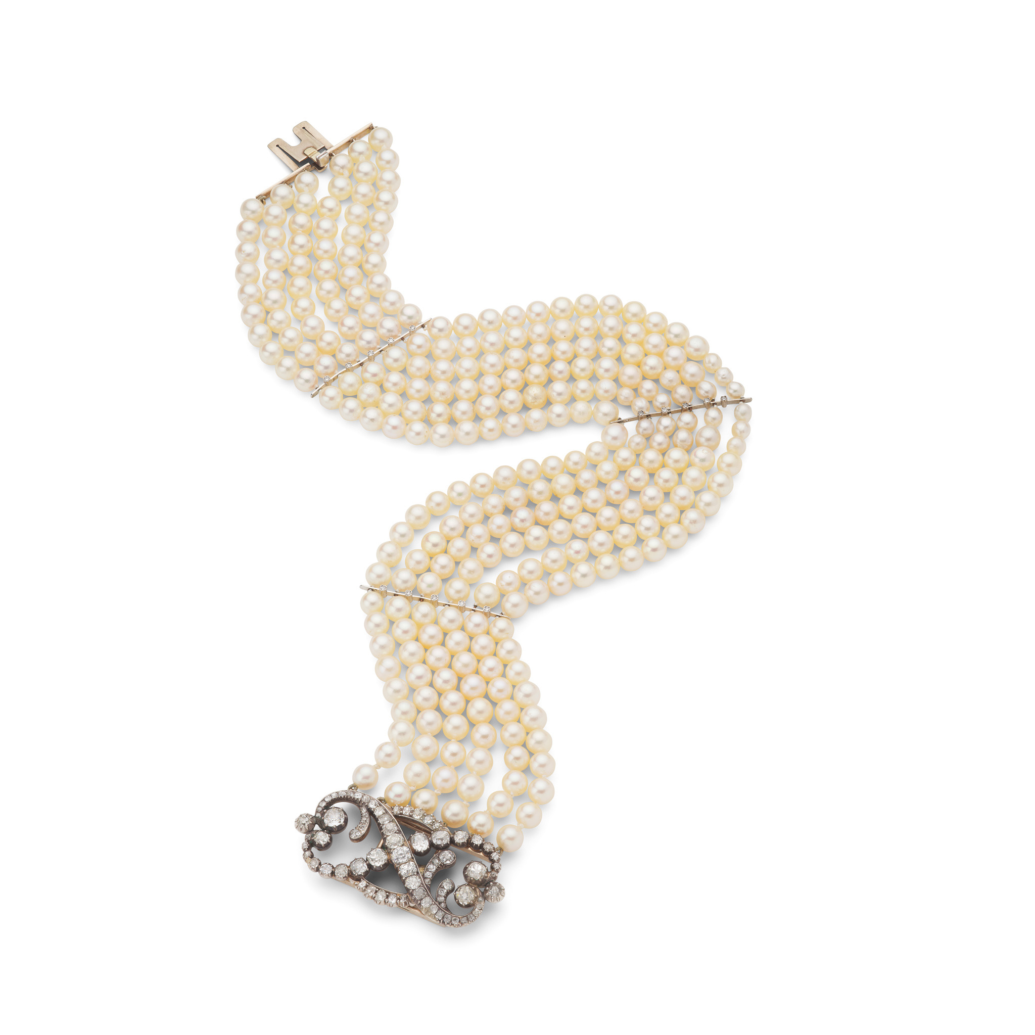 A cultured pearl and diamond multi-strand bracelet, the five strands of 5.8-6.6mm cultured pearls, to a rectangular clasp set with 7.8mm pearls, brilliant and single-cut diamonds.