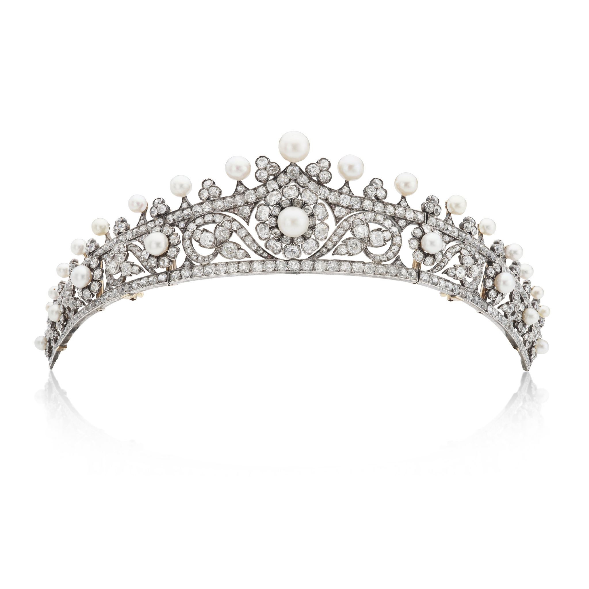 A late 19th century pearl and diamond tiara, set throughout with cushion-shaped, old brilliant and rose-cut diamonds, the pierced tapered form decorated with daisies, each centrally featuring a pearl, with cushion-shaped diamond ivy leaves, adorned by pearls and clovers across the crest, coming to a central apex with natural pearl.