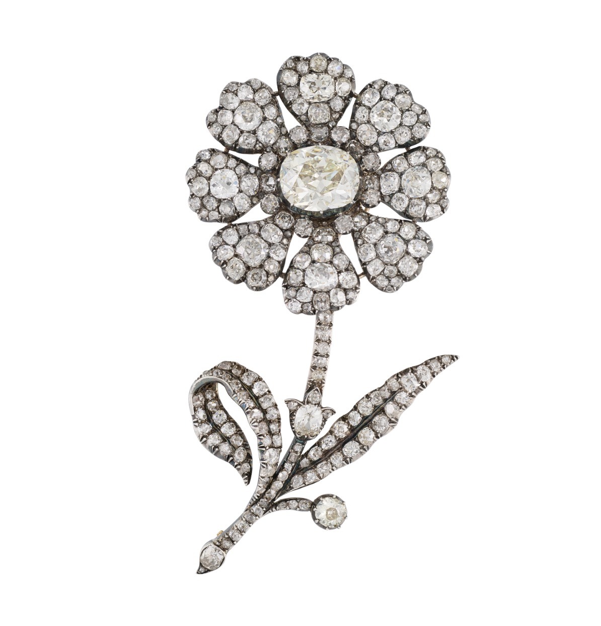 A late 19th century Diamond Flower Brooch with old, rose-cut and round diamonds, silver and gold, flowerhead detachable to wear as a pendant, circa 1880.