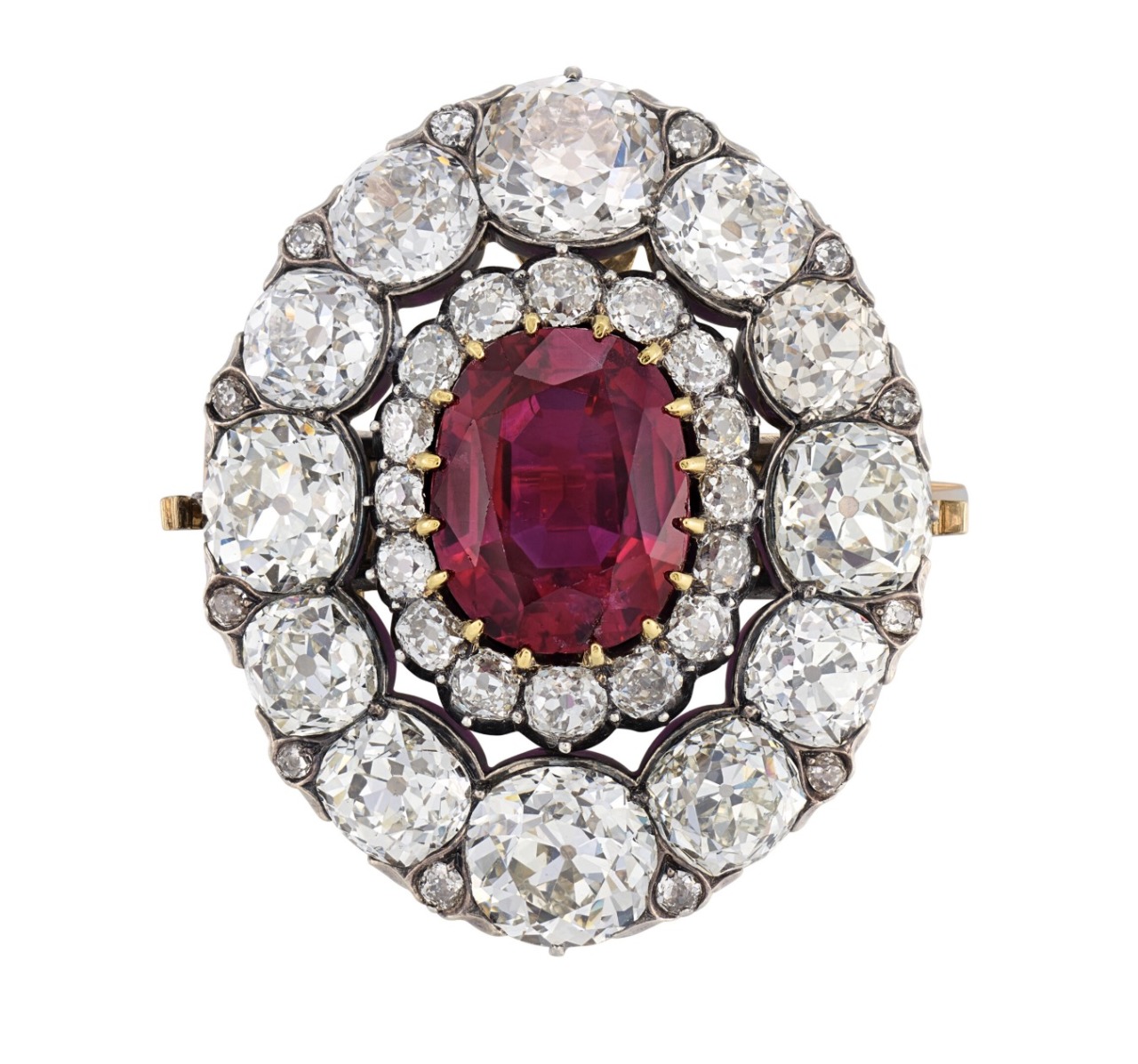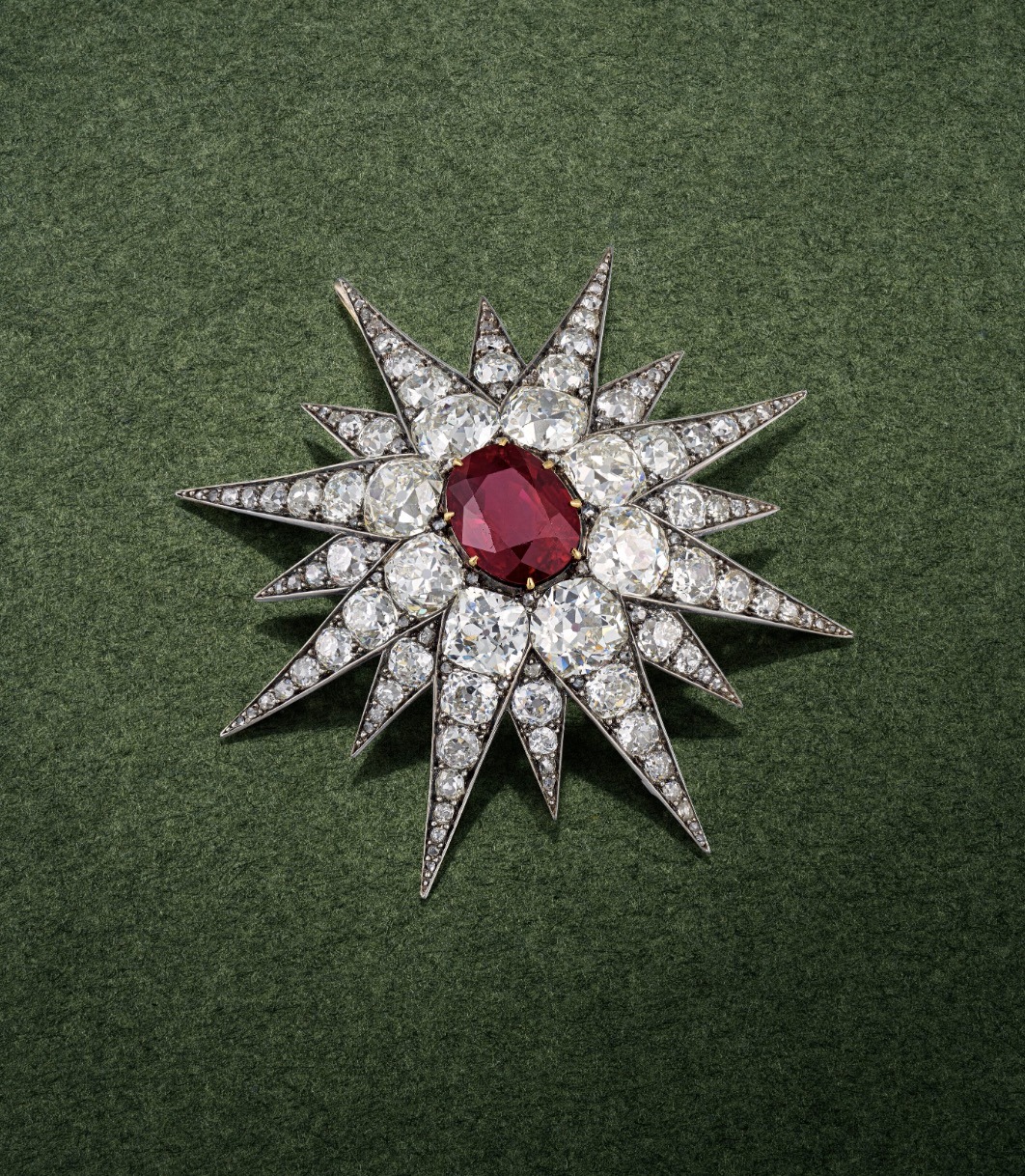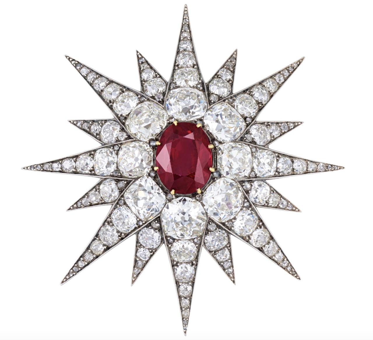 A superb late 19th century Ruby and Diamond Star Pendant/Brooch, with an oval-shaped ruby of 10.07 carats, old and rose-cut diamonds, silver and gold, brooch fitting detachable, circa 1880.