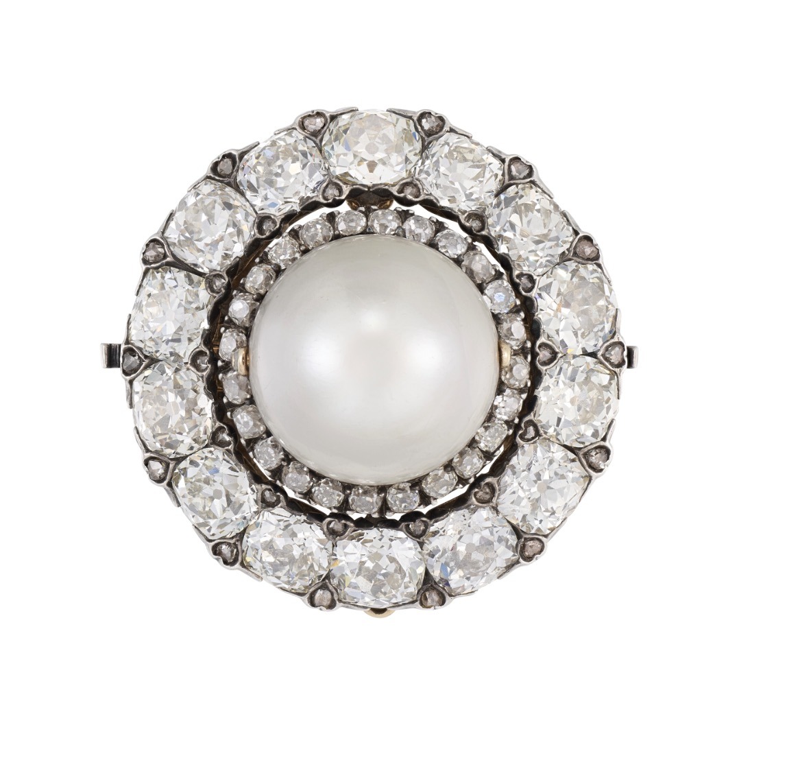 A late 19th century Pearl and Diamond Pendant/Brooch with a button-shaped natural pearl, old and rose-cut diamonds, silver and gold, brooch fitting detachable, circa 1880.