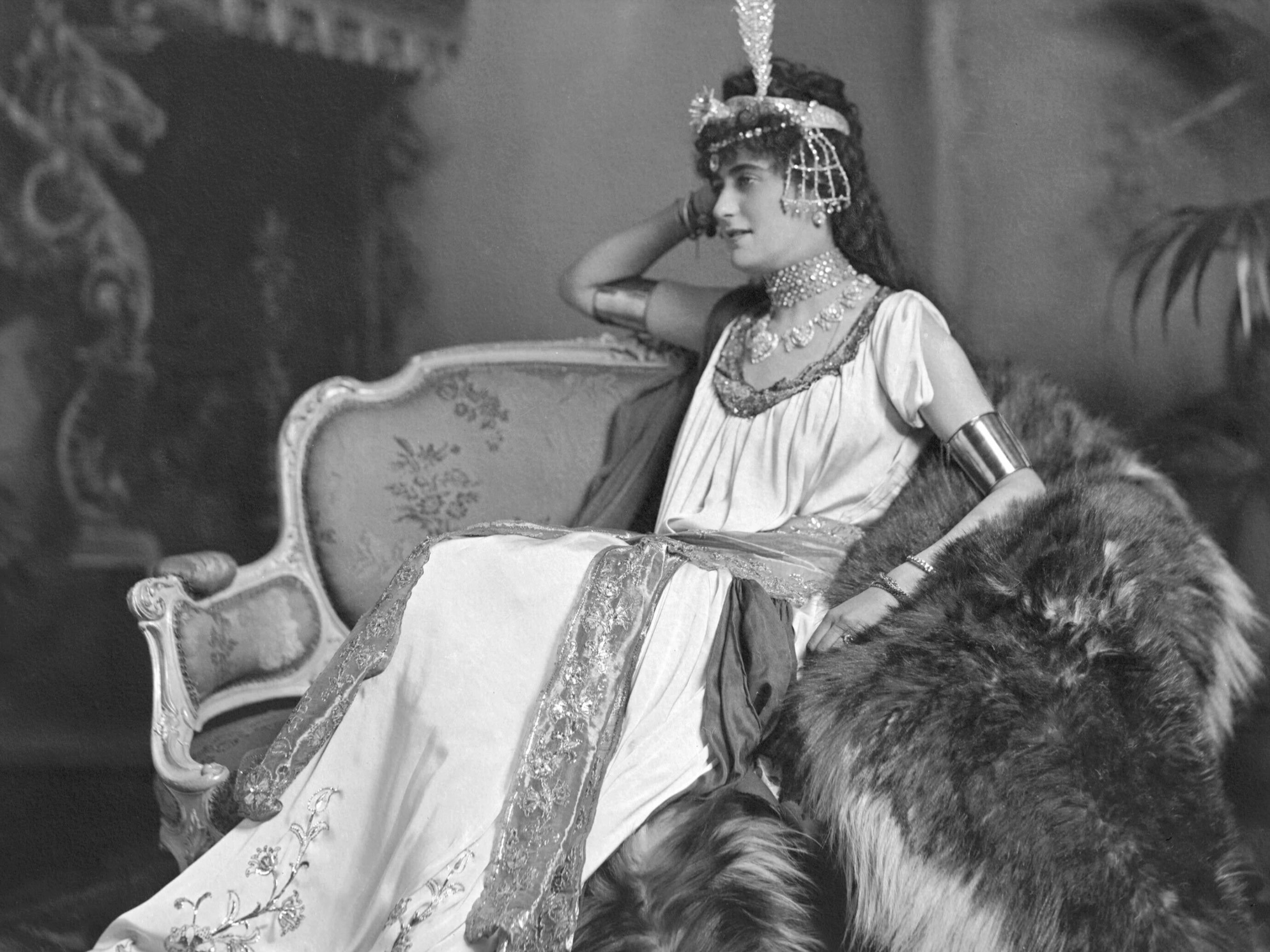 Before her marriage, Miss Helena Fraser, is also depicted as Delilah at The Devonshire House Ball in 1897, hosted by the Duke and Duchess of Devonshire at Devonshire House on Piccadilly, to celebrate the Diamond Jubilee of Queen Victoria. The fancy dress ball was attended by all the prominent figures of the day and provided the perfect occasion for a lavish display of jewellery and extravagant attire, as can be seen in the glamorous studio photograph of Miss Helena Fraser which shows her wearing the diamond palmette necklace, also offered here, as part of her costume.