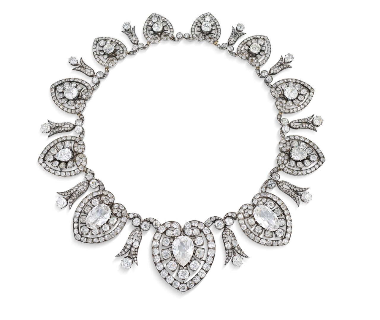 An Antique Diamond and Colourless Gem Tiara/Necklace with pear-shaped and old-cut diamonds, rose-cut diamonds, the three main pear-shapes later replaced with colourless stones, silver and gold, palmette clusters detachable (brooch fitting deficient), circa 1870.