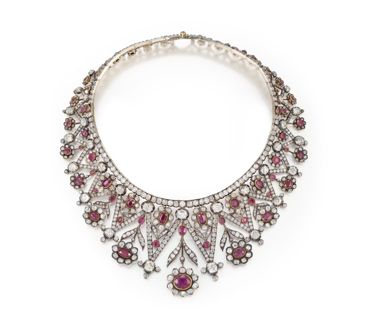 A fine late 19th century Ruby and Diamond Tiara/Necklace with an oval-shaped ruby of 4.02 carats, oval-shaped rubies, old-cut diamonds, silver and gold, back sections detachable for wear as a tiara, circa 1880.